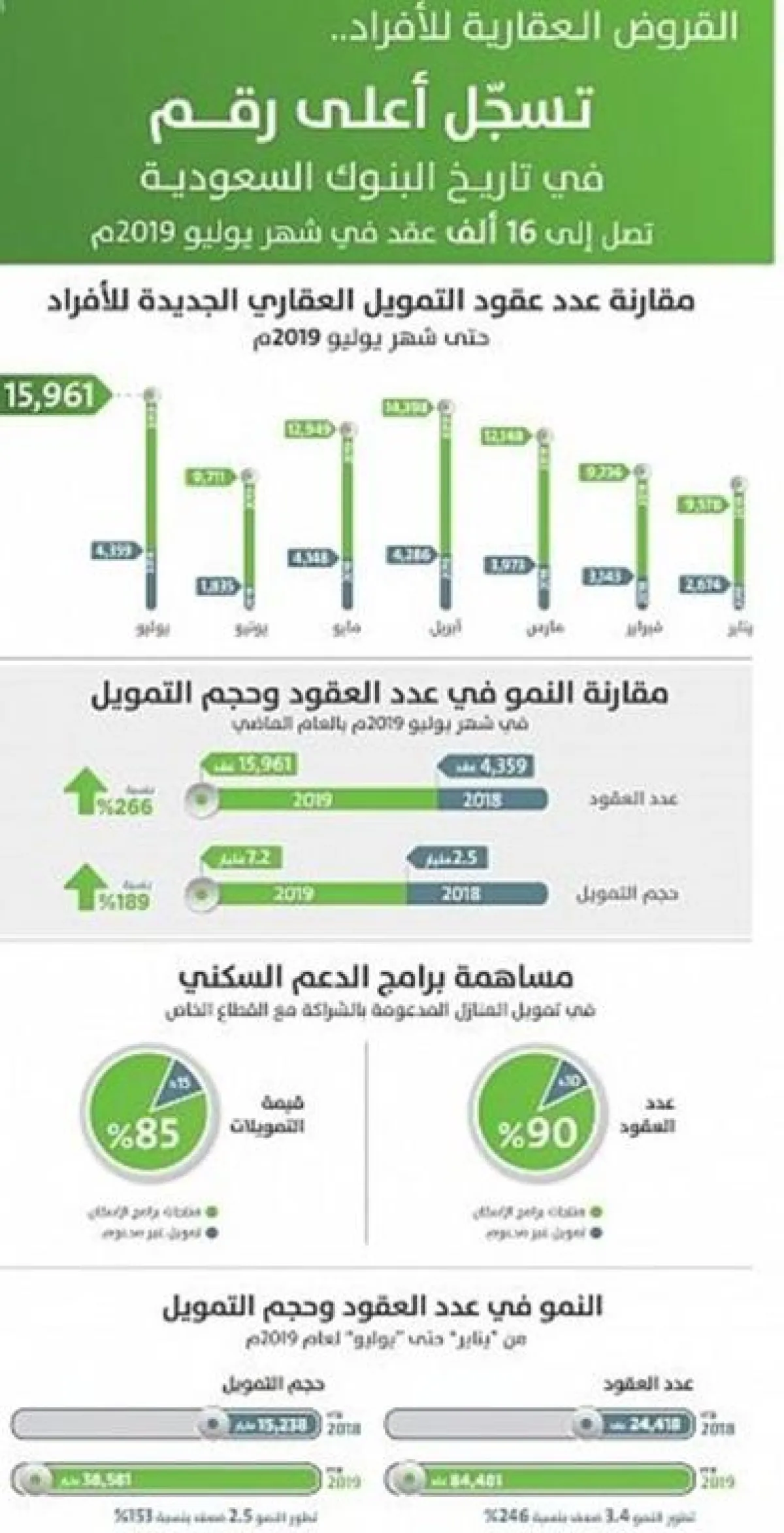 ولفت التقرير، إلى أن الزيادة في أعداد العقود تجاوزت 11 ألف عقد، إذ سجل شهر يوليو 2018م توقيع 4,359 عقداً مقابل15,961 عقداً في يوليو 2019م، كما زاد حجم التمويل العقاري في يوليو الماضي بنحو 5 مليارات ريال مقارنة بإجمالي التمويل في يوليو 2018م، الذي لم يتجاوز 2,492مليار ريال، مقارنة بنحو 7.2 مليار في يوليو 2019م.