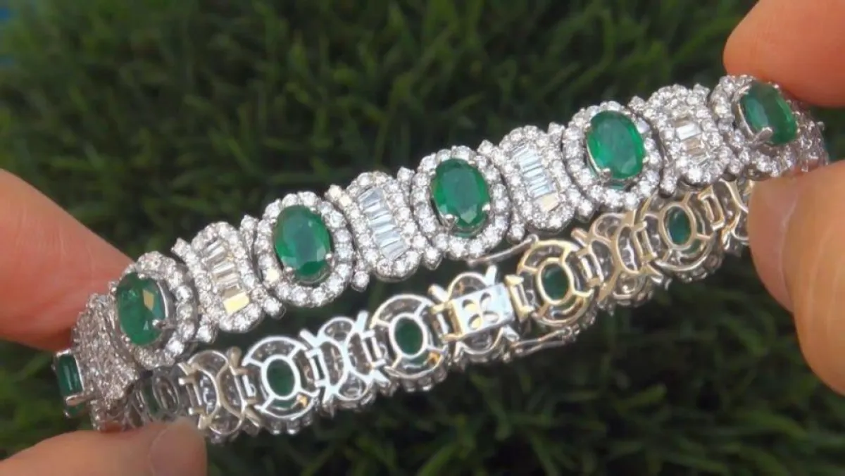 من علامة كارين سوين اختاري اسوارة راقية تتمتع بجاذبية وفتنة ساحرة باناقة الذهب الأبيض والماس وأحجار الزمرد الفاخرة.