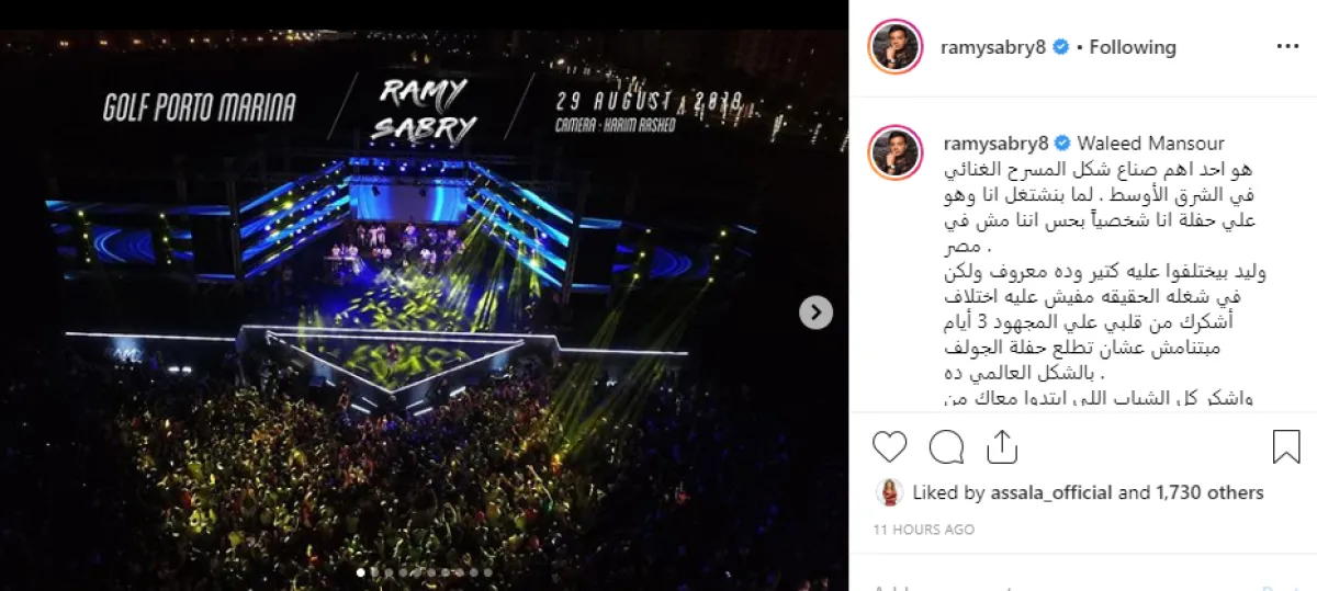 رامي صبري نشر عدة صور من حفله الأخير في جولف بورتو مارينا وسط حضور تجاوز 50 ألف معجب ووجه عبر حسابه بموقع إنستقرام رسالة خاصة إلى وليد منصور قال فيها: وليد منصور هو أحد أهم صناع شكل المسرح الغنائي في الشرق الأوسط لما بنشتغل أنا وهو على حفلة أنا شخصيا بحس أننا مش في مصر.. وليد بيختلفوا عليه كتير وده معروف ولكن في شغله الحقيقة مفيش عليه اختلاف».