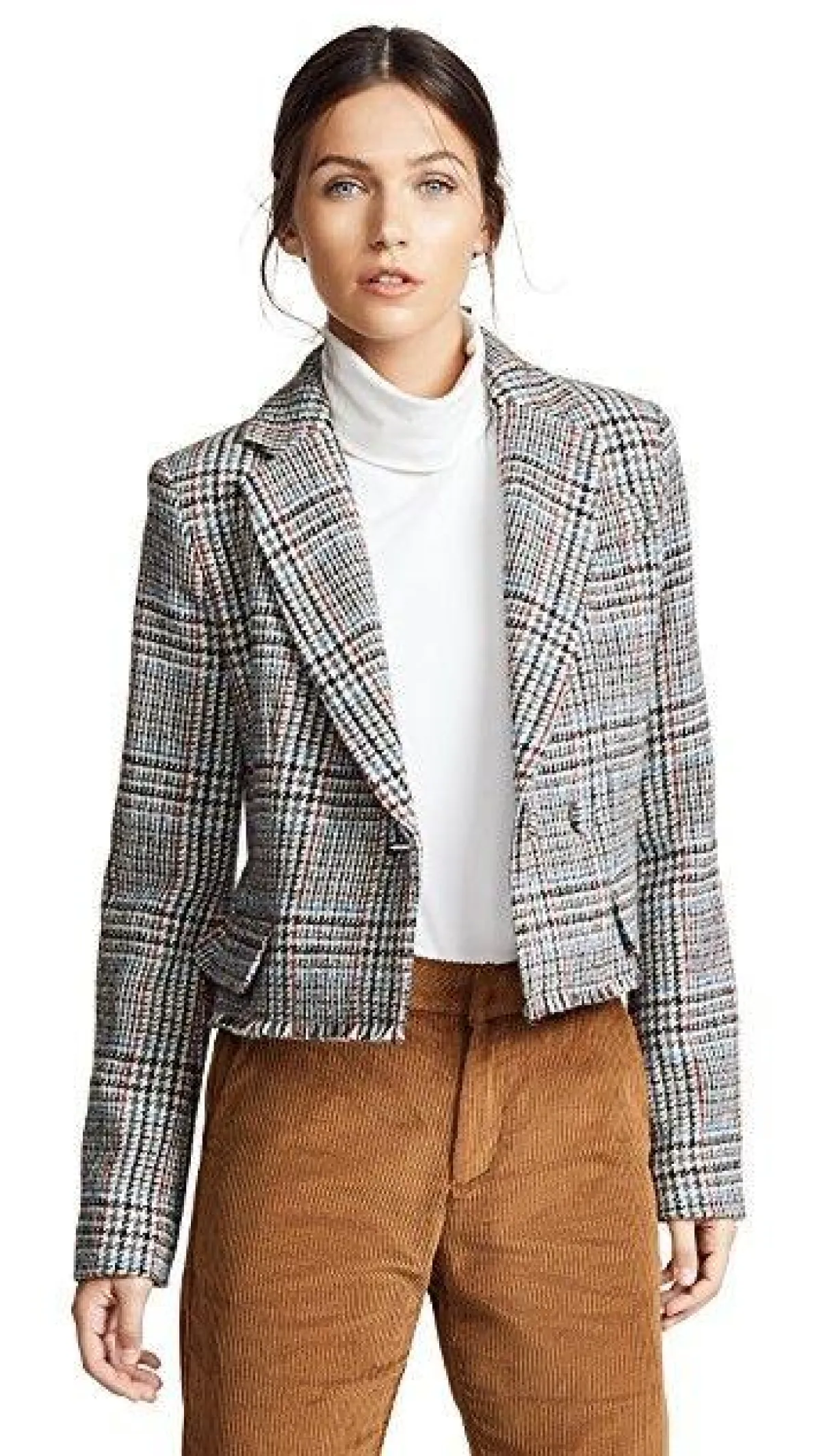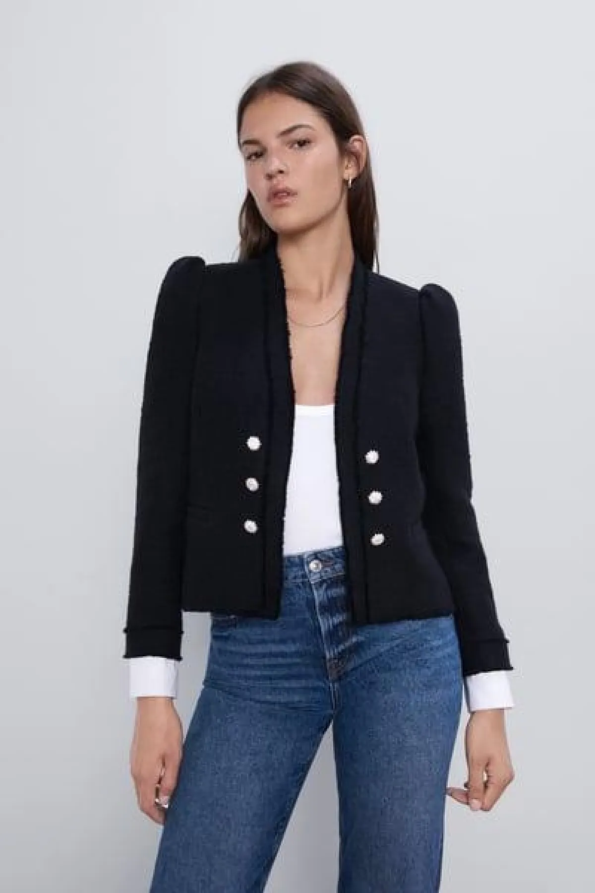 تمتاز تصميمات البليزرات القصيرة، أنها حادة من الأكتاف ولها ياقات بارزة، من ثم هي خيار مناسب لصاحبات الأكتاف النحيفة والمتوسطة، أما إذا كنتِ تعانين تمركز الدهون في الجزء العلوي، هنا سيكون تصميم الجاكيت القصير غير مناسب.