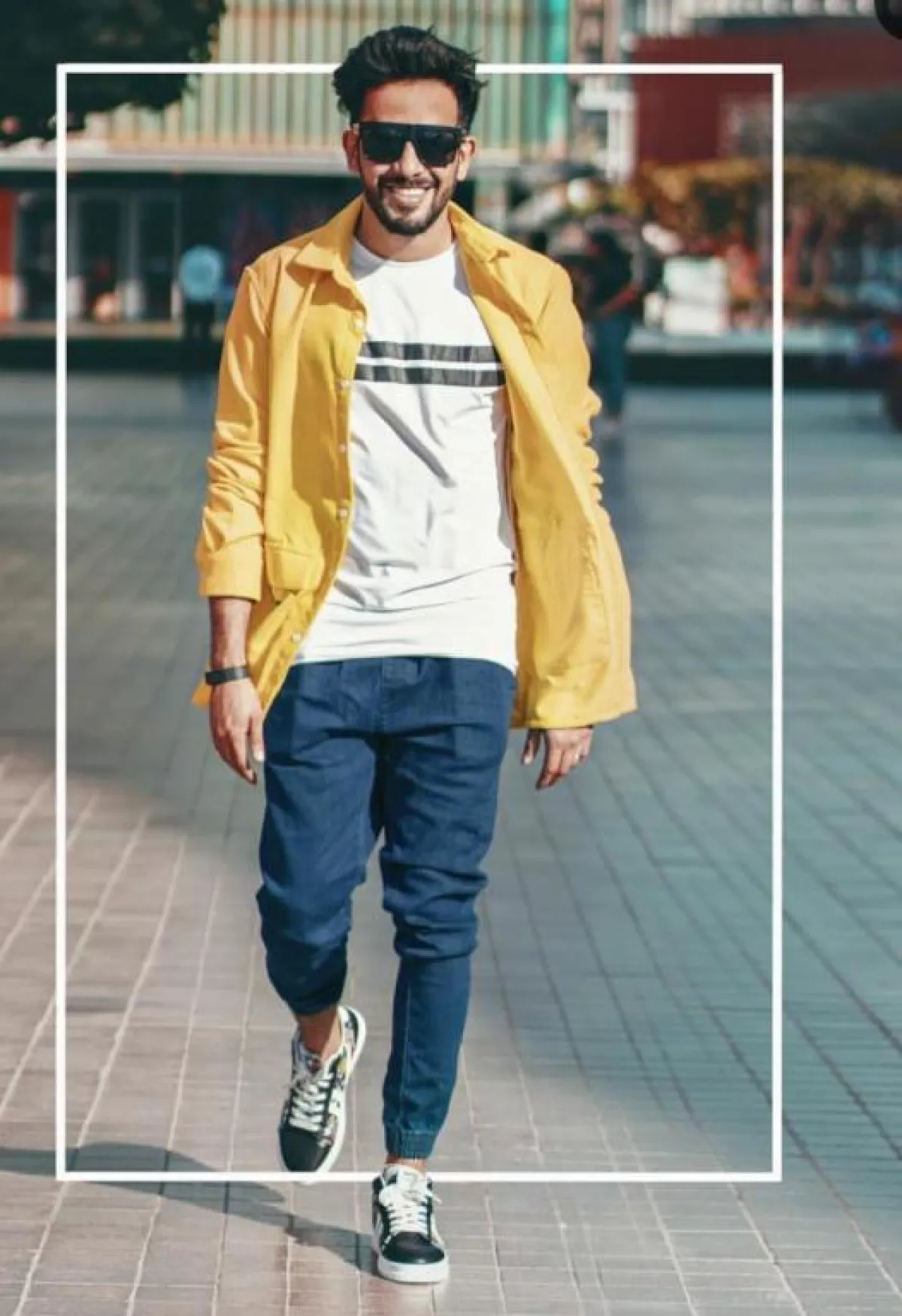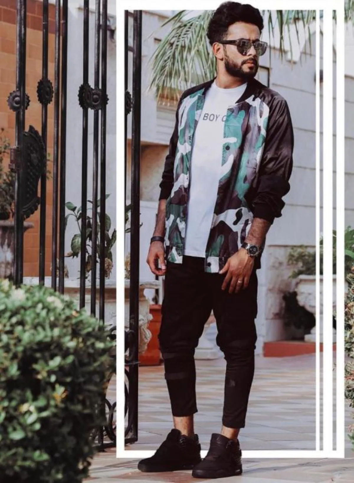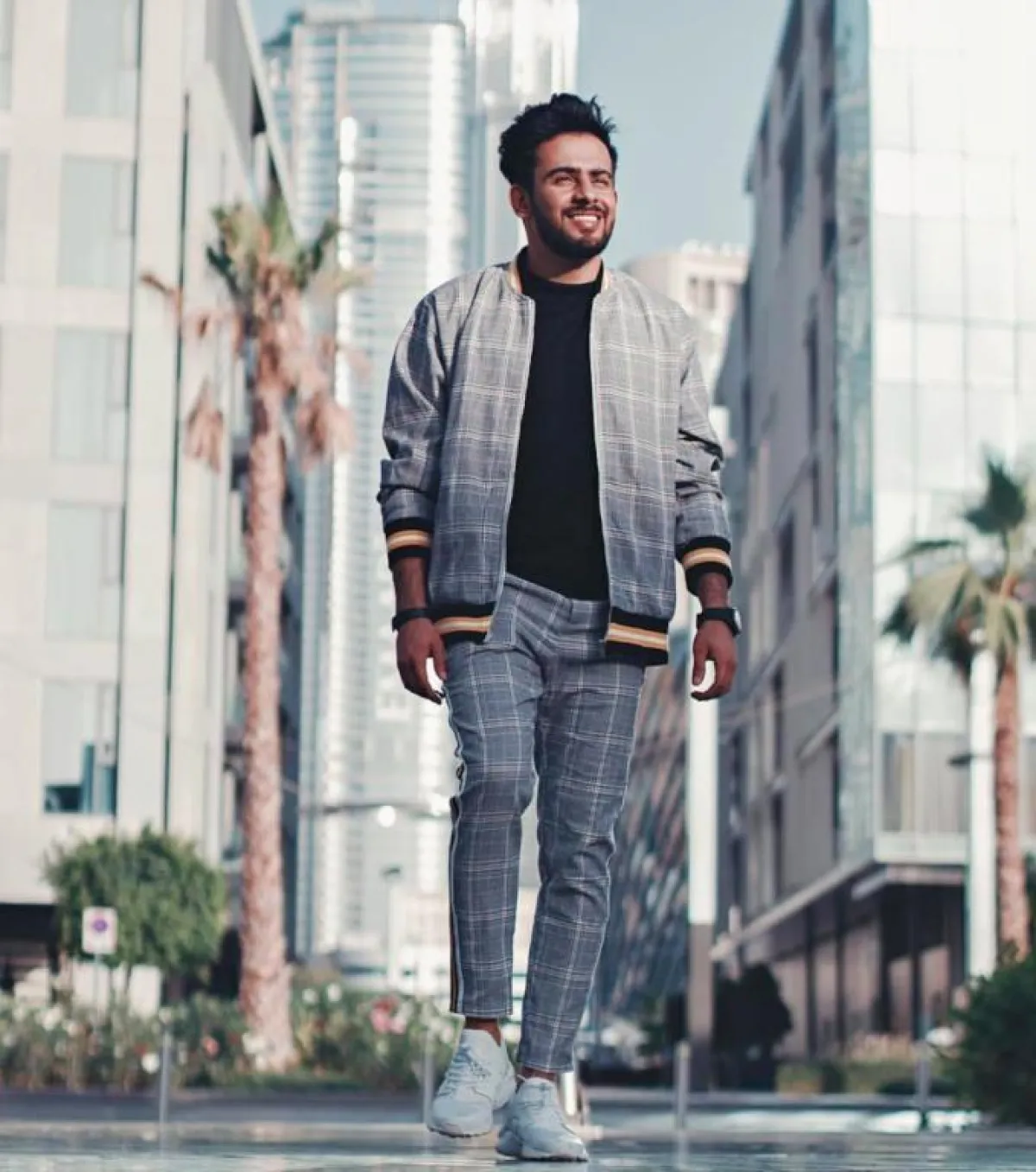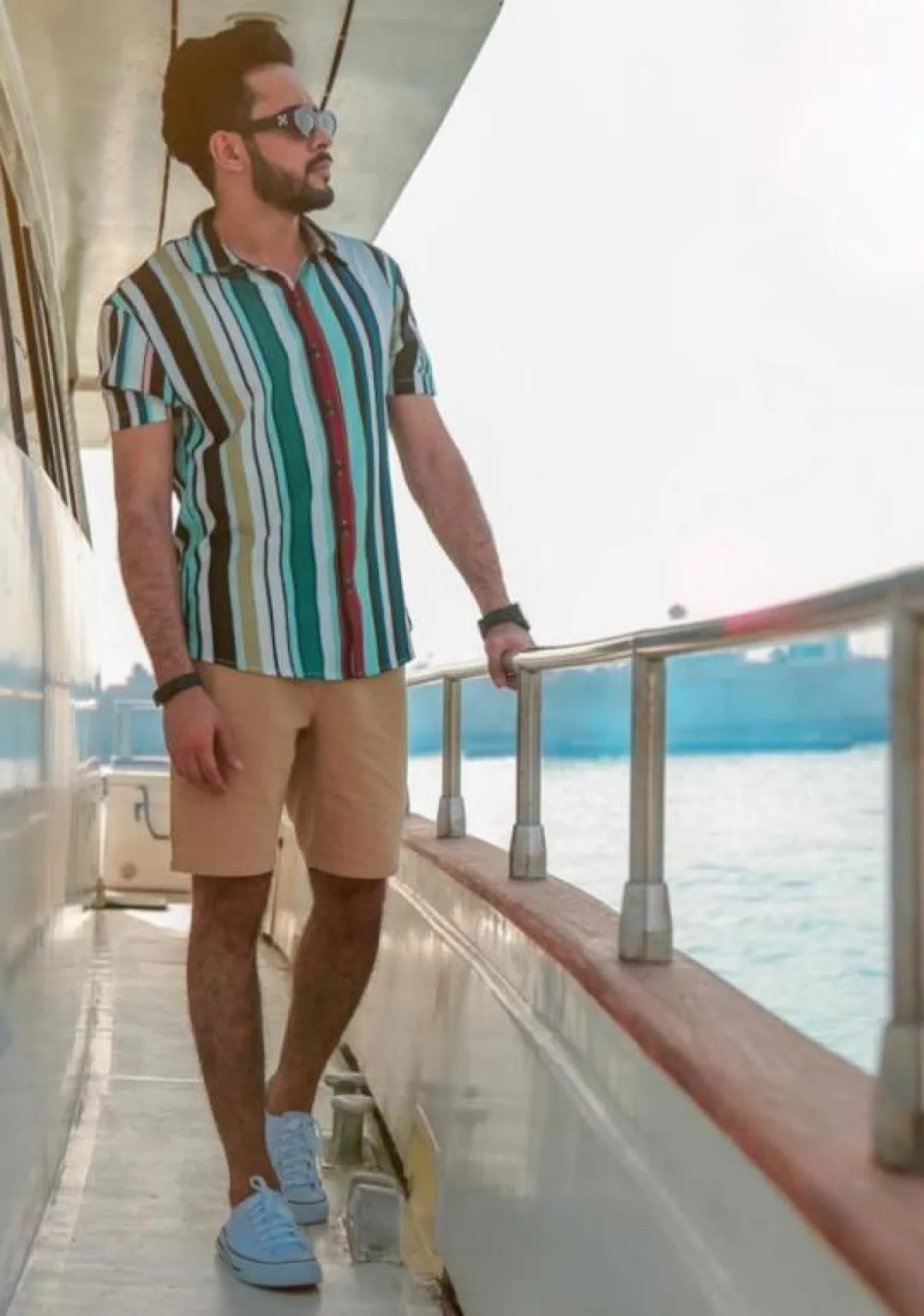 ونلاحظ أنّ هناك دائمًا لمسة عصرية ومتجددة في اطلالاته، تدل على حُسن اختيار أزيائه؛ حيث يُتقن اختيار الألوان والموديلات المختلفة التي تناسبه، وعادةً ما يرتدي التيشيرتات المختلفة مع البنطلونات الطويلة أو القمصان والبلوڤرات العصرية مع الشورتات، ويظهر بالمعاطف أو القمصان الملونة والبنطلونات الطويلة، ويحرص على اختيار موديلات أزيائه بأبرز صيحات الموضة الرجالية. ويميل للونين الأسود والأبيض بشكلٍ عام، كما يميل لاختيار الأحذية الرياضية، أما البنطلونات فيختار البنطلونات الملوَّنة كالكاروهات أو البني أو الكحلي أو الأخضر، وبالنسبة للتيشيرتات، فيميل للبسيطة التي تحتوي على كتابة أو علامات صغيرة، في حين يفضل الجاكيتات أو القمصان الملونة المُفْعَمَة بالحياة، ودائمًا ما يُكمل مظهره الأنيق باللون الأسود في أسورته وساعته المعتادين، ونظاراته الشمسية المختلفة.
