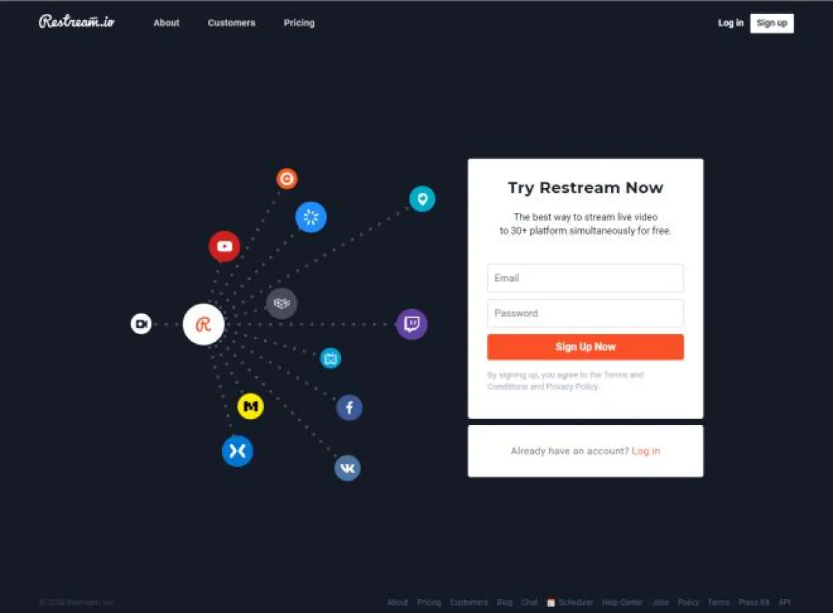 موقع Restream بسيط ومجَّاني؛ يحتاج المستخدم إلى إعداد حساب على الخدمة، والبدء في بثّ الفيديو على الحسابات الخاصَّة به.