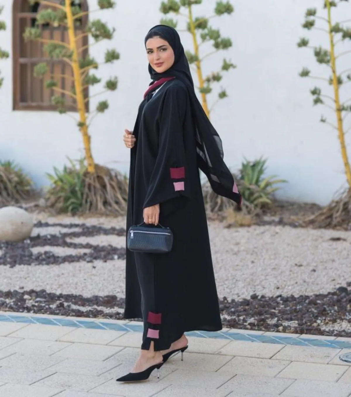 إن كنت ترغبين باختيار عباية سوداء بالكامل، أضيفي أكسسوارات أنيقة بلون مغاير، كأن تضيفي شال على كتف واحد بلون ناعم، أو أقراط تتدلى من تحت الحجاب، أو حتى حقيبة وحذاء بلون مميز مثل الأزرق الطفولي.