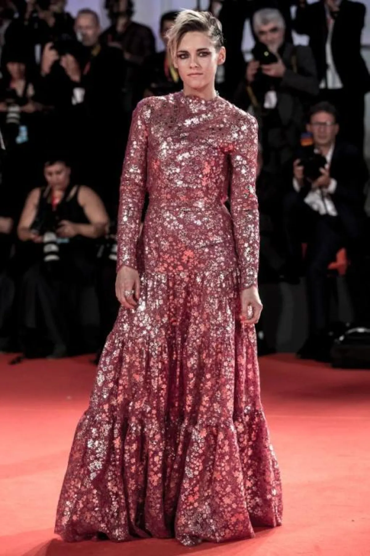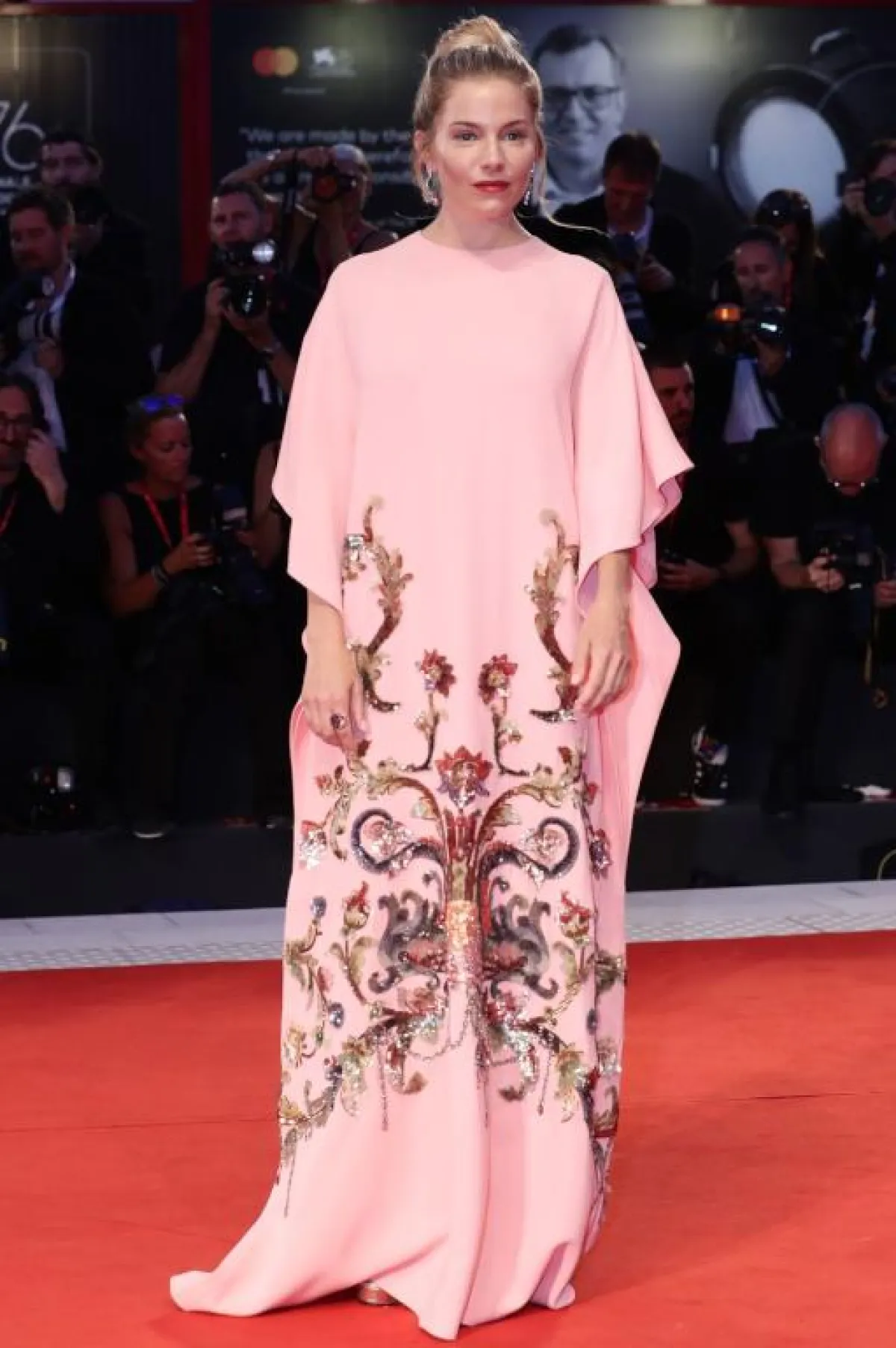 لا تستغني سكارليت جوهانسن عن الاطلالات الجذابة في مختلف المناسبات، مثل الاطلالة التي اختارتها على السجادة الحمراء الخاصة بمهرجان البندقية، وكانت عبارة عن فستان سهرة من الترتر باللون الأحمر من دار سيلين Celine بقصة ضيقة مكشوفة الأكتاف، وله فتحة طويلة على الساق، وقد نسقت معه صندلًا بكعب عالٍ من اللون نفسه.