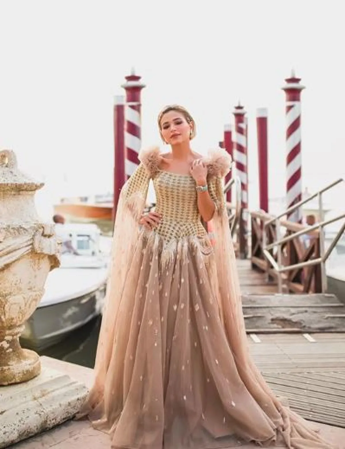 حضرت النجمة الإسبانية بينيلوبي كروز Penelope Cruz فعاليات اليوم الخامس من مهرجان البندقية، في اطلالة مبهرة باللون الأبيض اختارتها من دار رالف أند روسو Ralph&Russo، وكانت عبارة عن فستان أوف شولدرز من التول، بدا مشابهًا لفساتين الزفاف من ناحية القصة ولا سيّما التنورة المصنوعة من طبقات من الكشكش، وقد اكتفت بتزيين اللوك ببعض المجوهرات الناعمة.