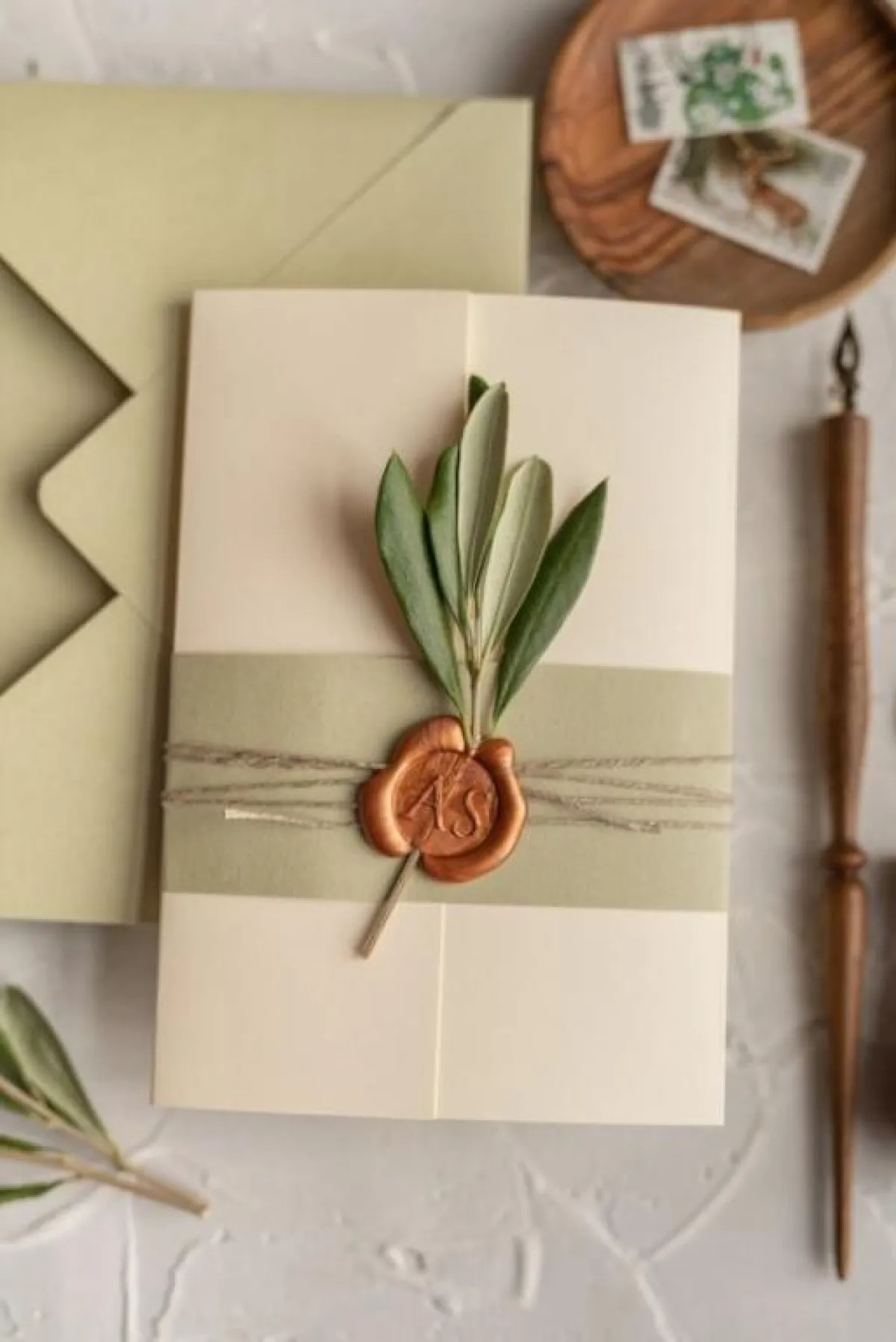 يمكنكِ اختيار رسومات أوراق الشجر، أو تضعين ببطاقة الزفاف ورود مجففة مع رائحة مميزة، أو تختاري ورودًا طبيعية لتصميم منعش أكثر، وقد تناسب هذه البطاقة حفل زفافكِ إن كان في منطقة مفتوحة.