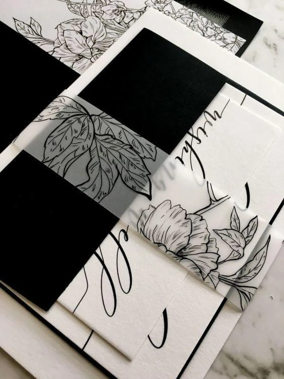 إذا كان ديكور حفل زفافكِ سوف يعتمد على الألوان المحايدة والستايل ذي اللمسات الفنية، فيمكن أن تشوّقي المدعوين للحفل، ببطاقة زفاف مونوكروم بلوني الأبيض والأسود.