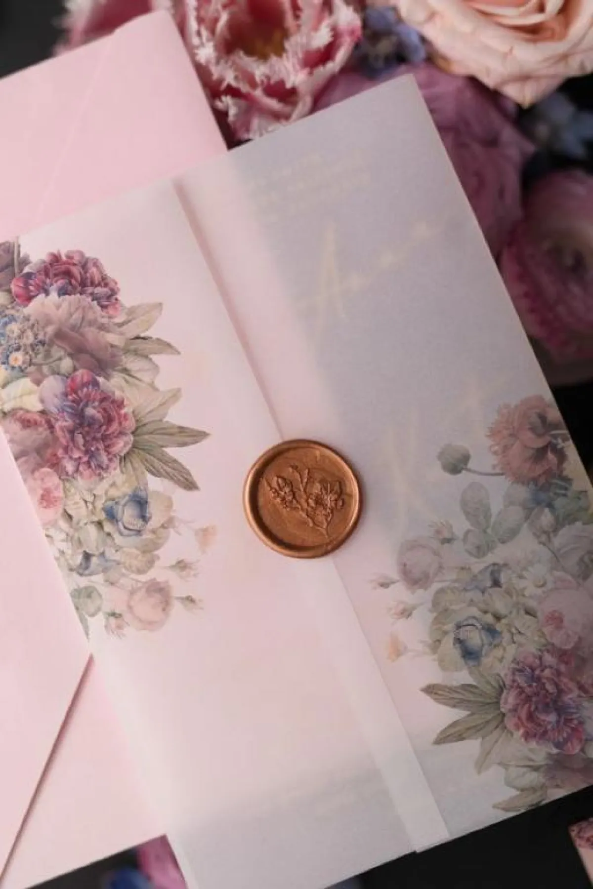 أما إن كان حفلكِ مزينًا بالورود الملونة، وغاية في الرومانسية، وأنتِ أيضًا تتمتعين بذوق حالم، فلِمَ لا تعبّرين عن ذلك ببطاقة زفاف وردية ناعمة باللمسات المخملية، مع الورق الشفاف أو الكريمي، لتتناغم ألوان البطاقة مع بعضها.