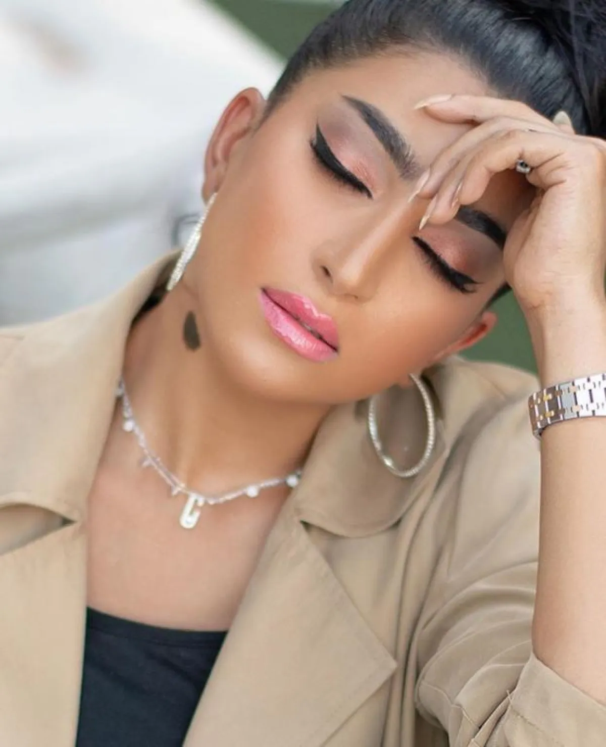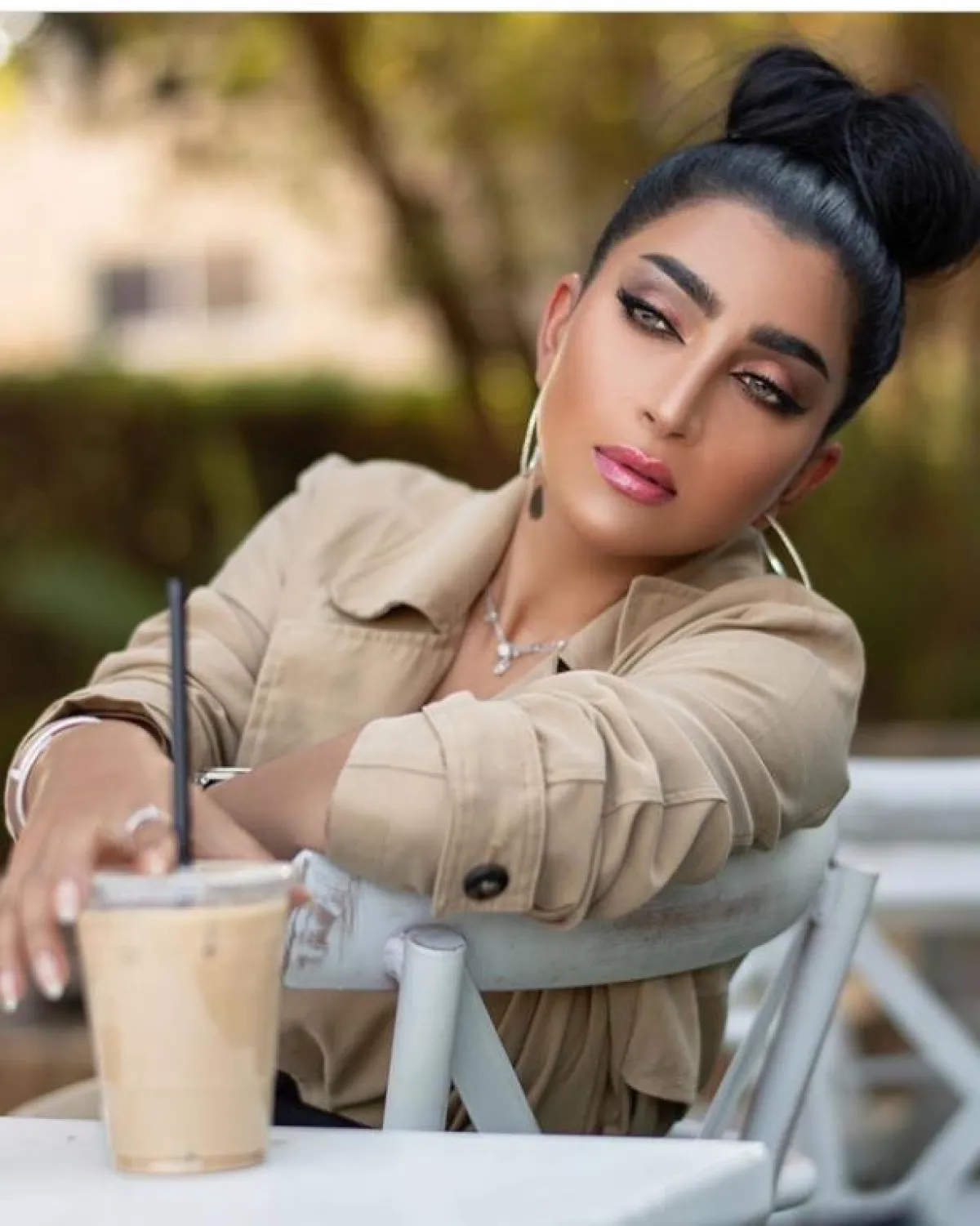 أما إذا كنتِ تفكرين بمكياج خليجي، ولكن بالوقت نفسه تفكرين بالألوان الترابية الهادئة، فيمكنكِ عمل كونتور الوجه الصارخ كهذا اللوك من فاطمة الصفي، مع أحمر الشفاه الغلوس النود الداكن، وظلال الجفون البنية.