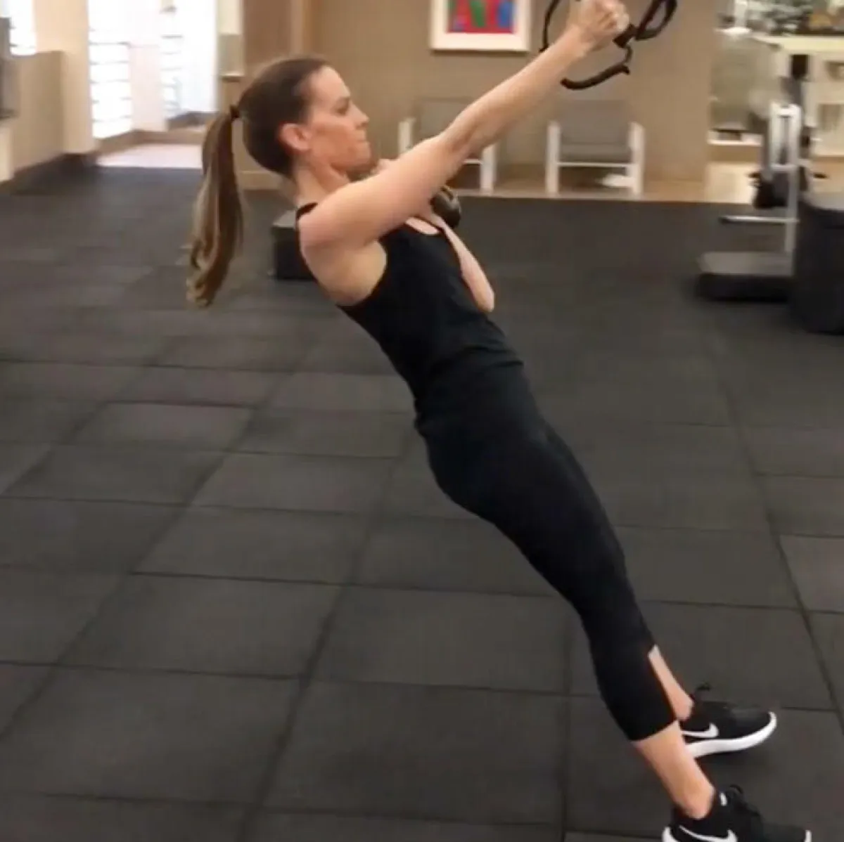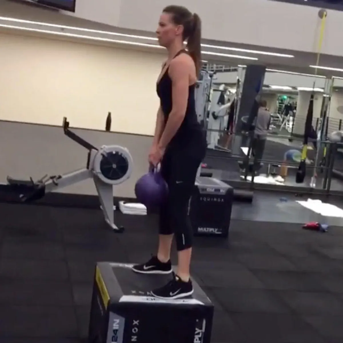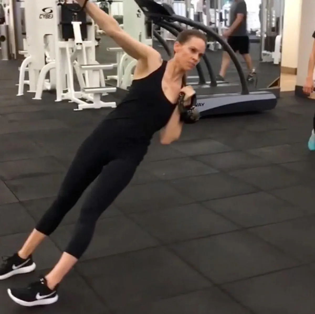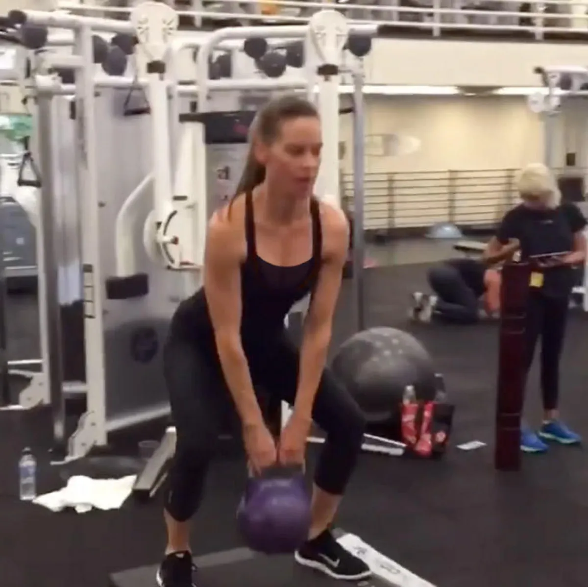 تقضي المُمثِّلة هيلاري سوانك Hilary Swank (44 سنة) وقتًا طويلًا في النادي الرياضي، وهي تُشارك المعجبين تمارينها الرياضيَّة على انستقرام في سلسلة تسميها #FitnessFriday. في أحد مقاطع الفيديو، يظهر جسد المُمثِّلة الفائزة بجائزة الأوسكار الرشيق، فيما هي تؤدي تمارين حاملة كرة الوزن kettlebell، وتدفع بالزلاجات.