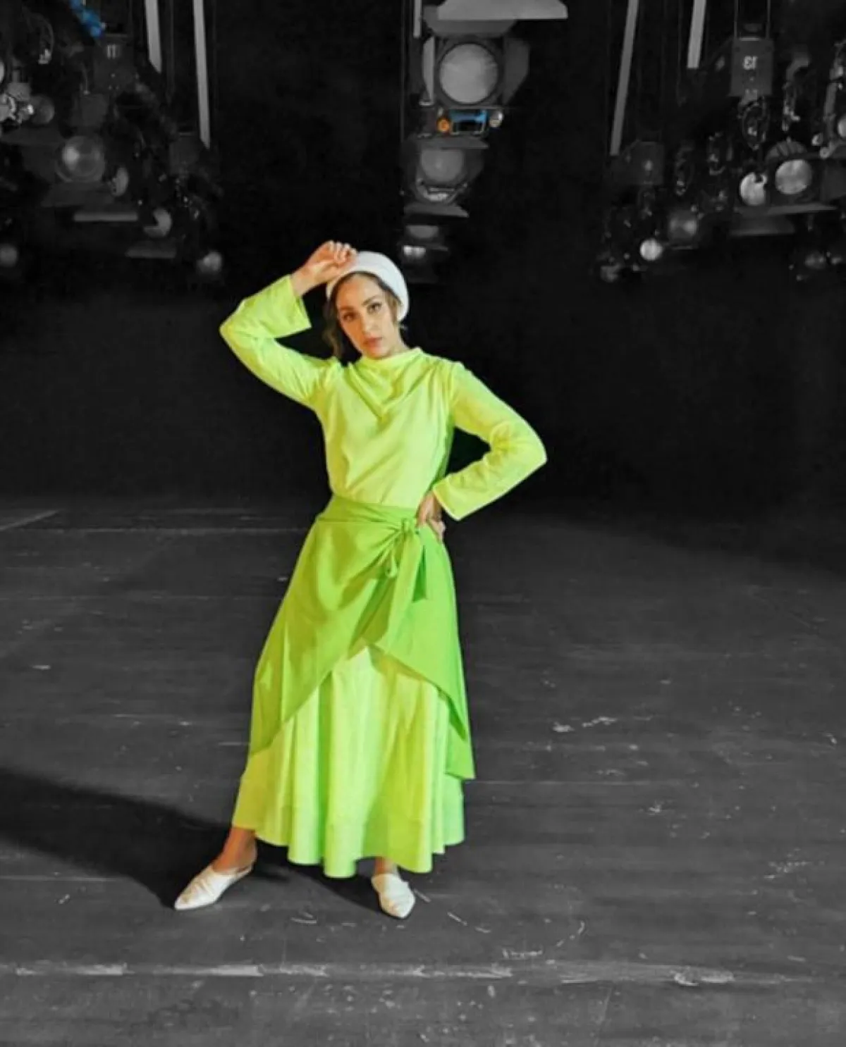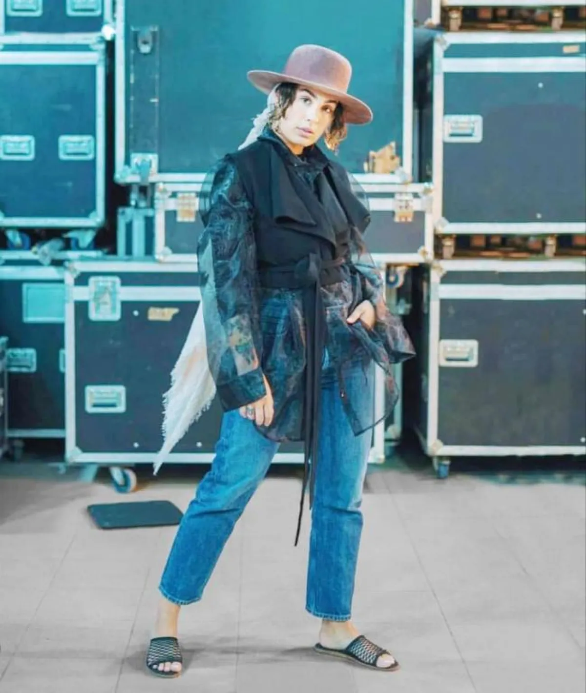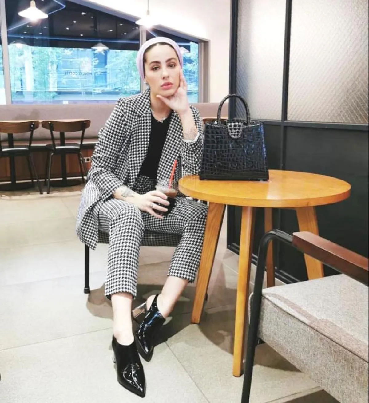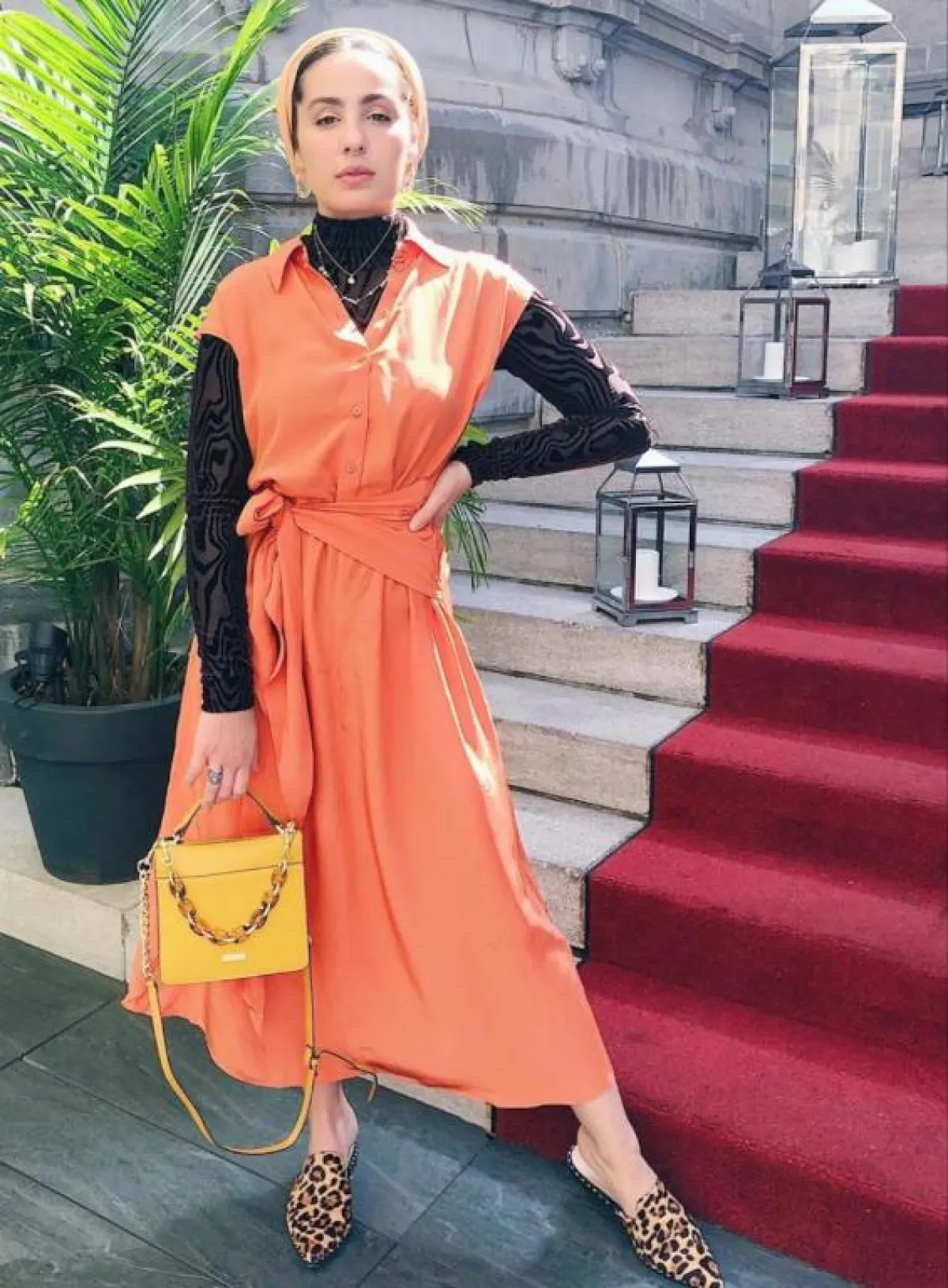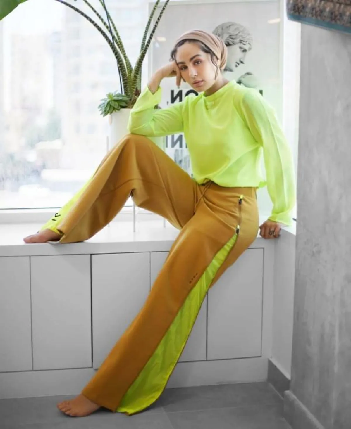 كما اختارت بنطالًا باللون البيج مع بلوزة بطبعات برتقالية وسوداء، وأكملت ملحقاتها بالأسود، وتألقت ببنطال بُنّي واسع مزين باللون الفوسفوري، وبلوزة بأكمام طويلة فوسفورية اللون، وتزينت باطلالة يكسوها اللون الأسود من الجاكيت الجلد والفستان، إلى الحقيبة والحذاء، وكسرت اللون بحجابها البيج، وظهرت ببنطال وجاكيت باللون البني تكسوهما طبعات نمرية وحذاء أسود بفرو بُنّي.
