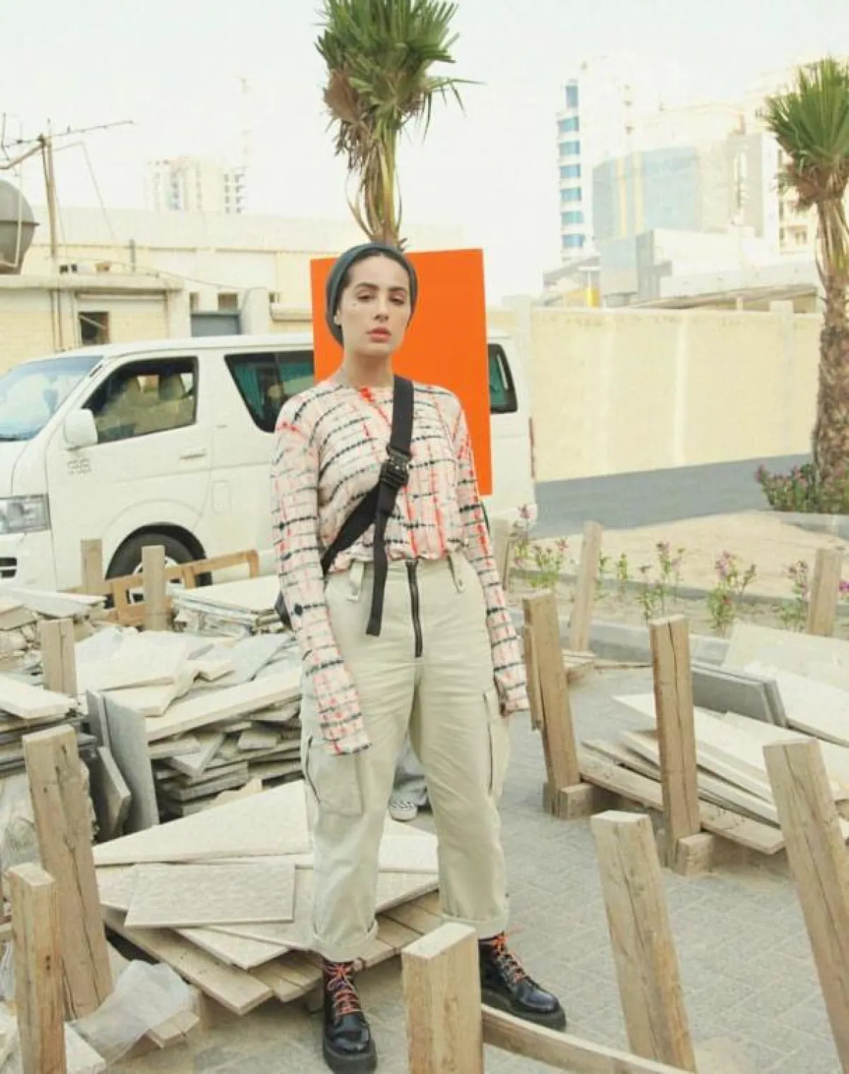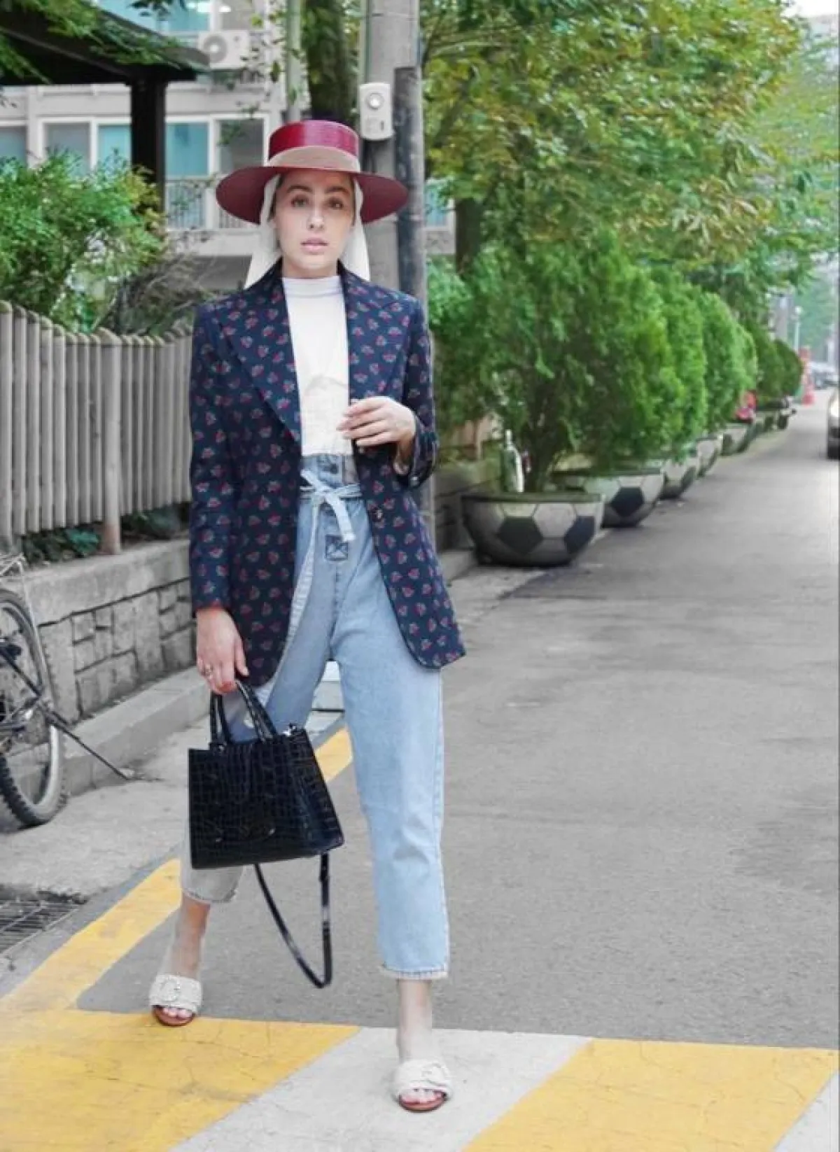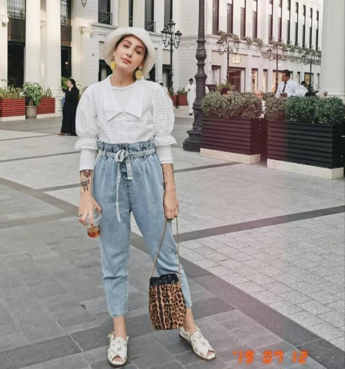 ولاطلالة عملية ظهرت ببنطال جينز وبلوزة مخططة باللونين الأبيض والرمادي وحجاب رمادي، مع حذاء وحقيبة باللون الأسود، وتزينت ببلوزة بيضاء بمربعات وأكمام واسعة بمطاط، وبنطال جينز مع حقيبة نمرية وقبعة من القش، وارتدت بنطالًا من الجينز، وبلوزة سوداء مع جاكيت برتقالي جينز، وبنطالًا نمريًّا مع جاكيت بيج، وأطلَّت ببنطال جينز مع بلوزة بيضاء، ومعطف كحلي بطبعات حمراء، وحقيبة سوداء لاطلالة محايدة اللون.