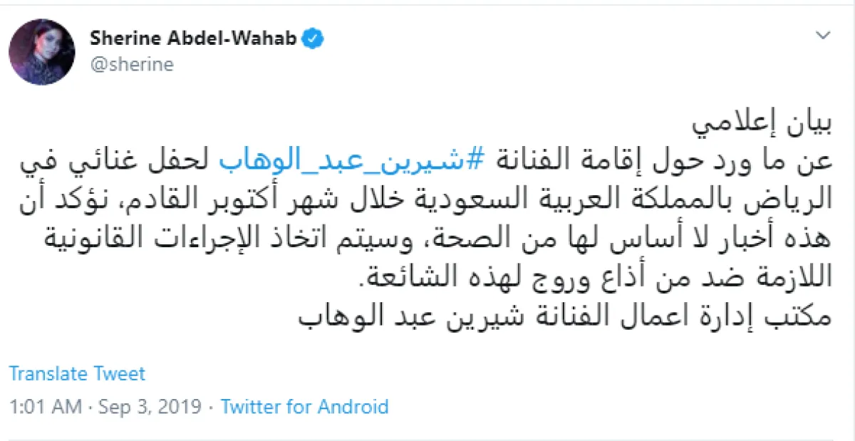 وقال المكتب الإعلامي في البيان الرسمي: عن ما ورد حول إقامة الفنانة #شيرين_عبد_الوهاب لحفل غنائي في الرياض بالمملكة العربية السعودية خلال شهر أكتوبر المقبل، نؤكد أن هذه أخبار لا أساس لها من الصحة، وسيتم اتخاذ الإجراءات القانونية اللازمة ضد من أذاع وروج لهذه الشائعة.