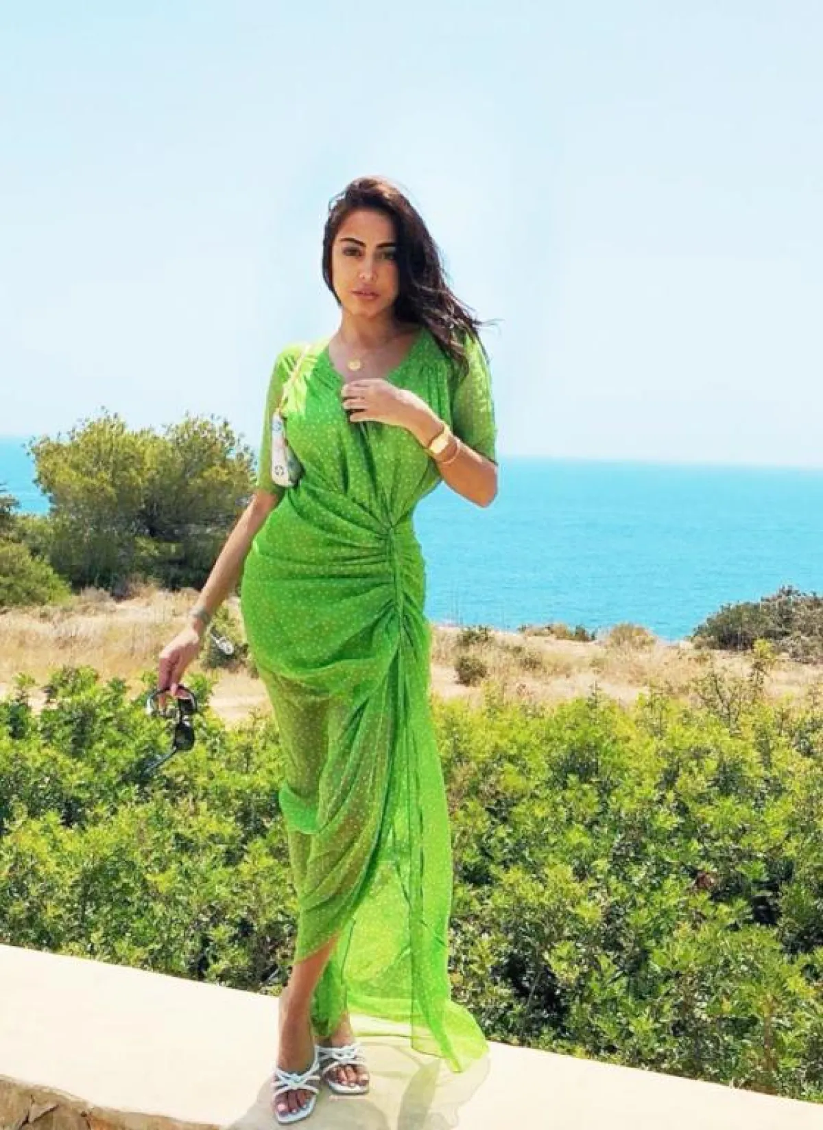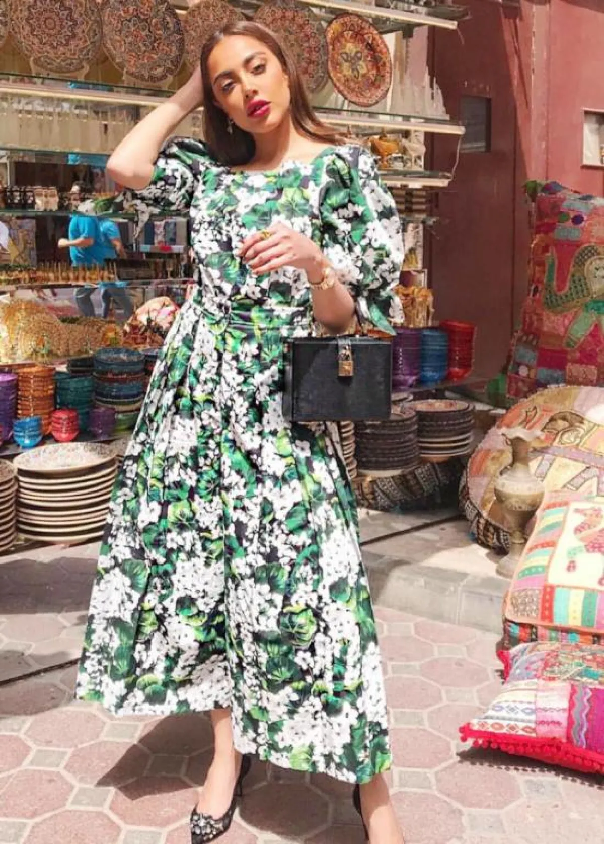 كما تجمَّلَت فاطمة المؤمن بفستان واسع مزيَّن بزهور بيضاء وأوراق شجر خضراء مصمَّم بأكمام منفوخة، وتميزت بفستان ناعم وأنيق باللون الأخضر، مزيَّن بنقط بيضاء وأكمام قصيرة وقصة لافتة في البطن.