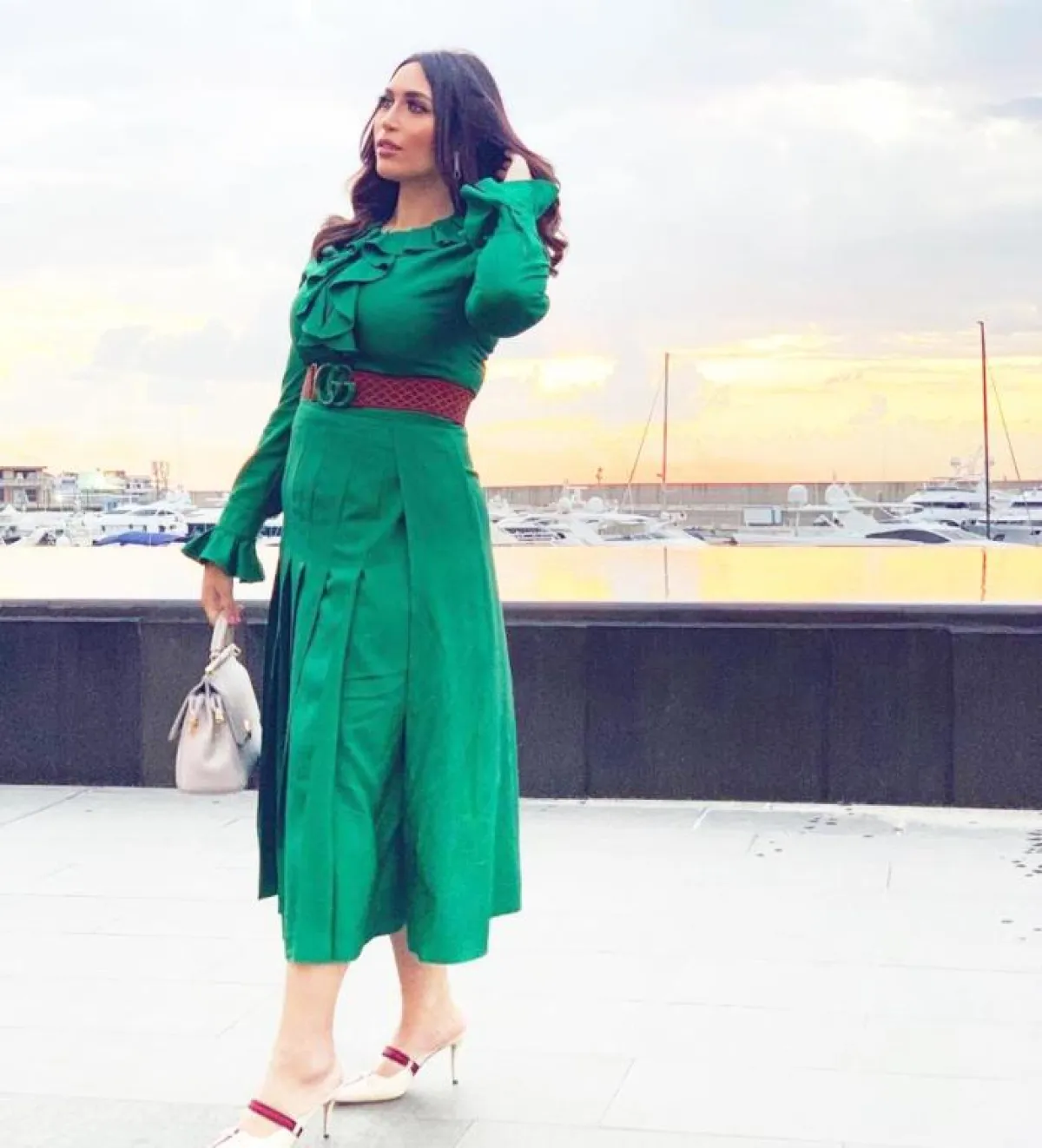 ونسَّقت شوق محمد فستانًا أخضر رياضيًّا بكتابة مع حزام خصر أسود وكاب، وحقيبة وحذاء رياضي باللون الأسود، وفستانًا أخضر بأكمام منفوخة ومطاط، وجَمَّلَ الفستانَ حزامُ خصر وأزرار عدة في منطقة الصدر.