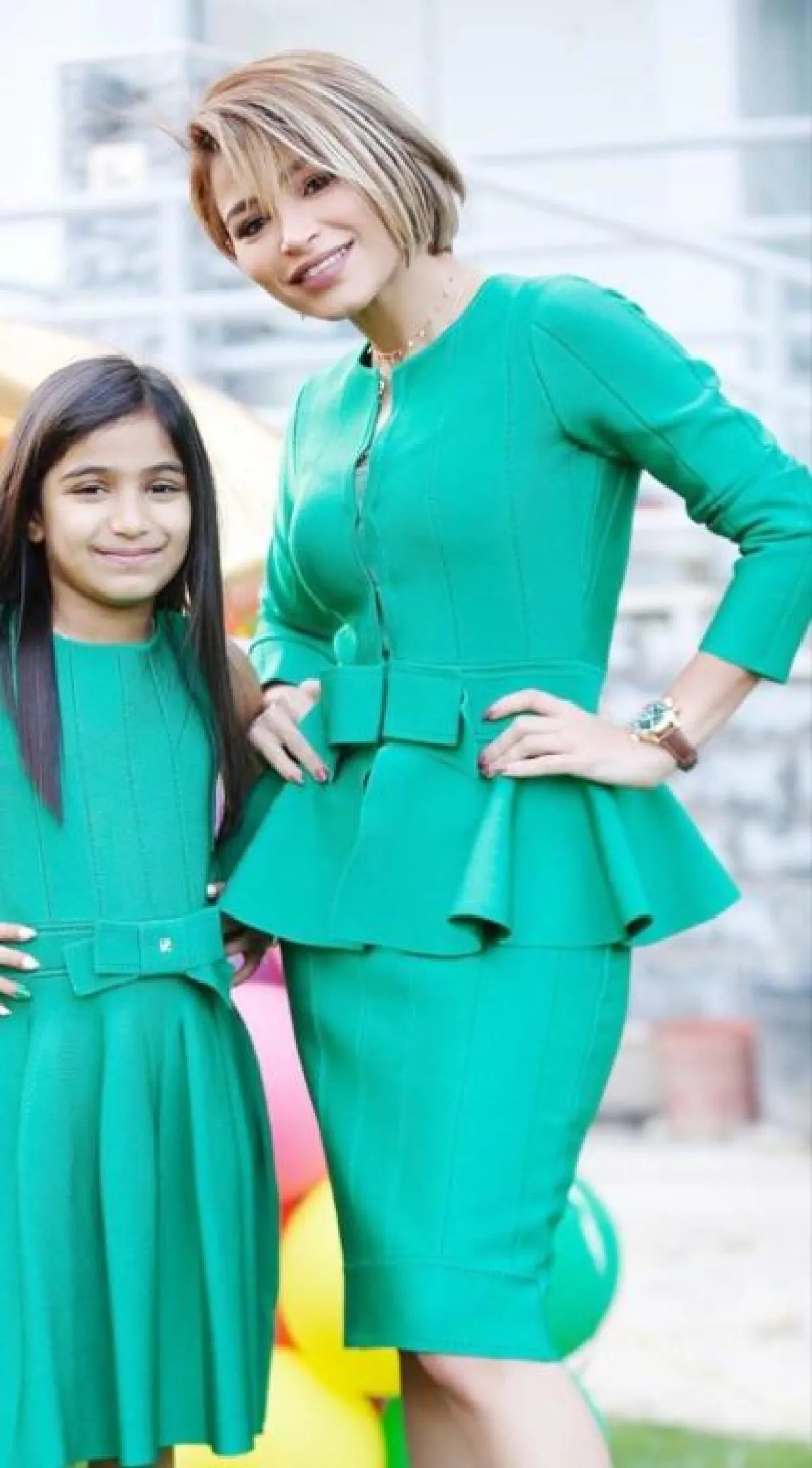 جاءت نوف نبيل بفستان أخضر بأكمام طويلة مزيَّن بزهور عدة ملونة، أما شقيقتها نهى نبيل فقد تزينت بتنّورة منقوشة بخطوط ناعمة وبلوزة بحزام فيونكة وكشكشة من الأسفل، وفستان يكسوه الترتر بقَصَّة خصر مميزة.