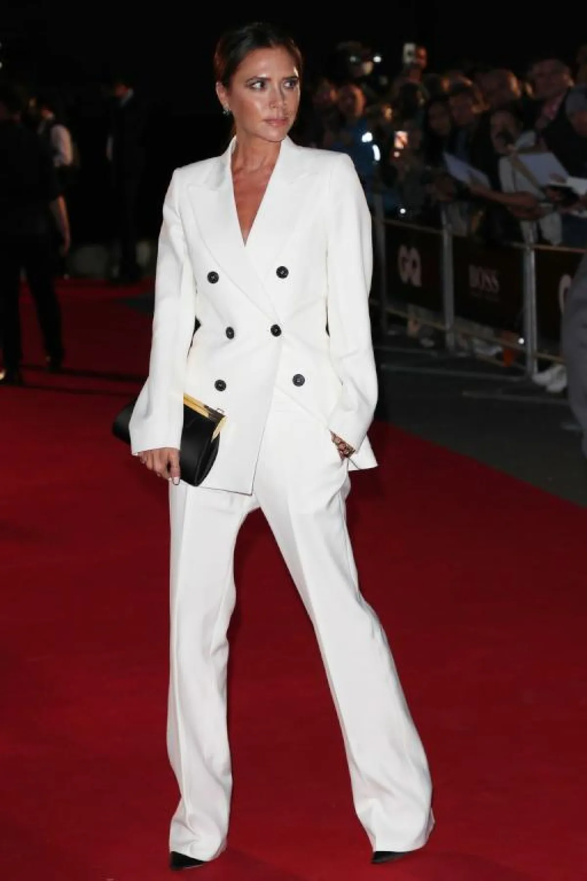 البدلات الرسمية إحدى أبرز صيحات الموضة لهذا الموسم، وفيكتوريا بيكهام Victoria Beckham من أفضل من يصنعها ومن يرتديها أيضًا، مثل اطلالتها مساء أمس في حفل GQ في بدلة باللون الأبيض من تصميمها، مؤلفة من بليزر بصفّيْ أزرار، وبنطلون بقصة أرجل واسعة، وقد نسقت معها حذاءً بكعب عالٍ وحقيبة كلاتش أنيقة باللونين الأسود والذهبي.