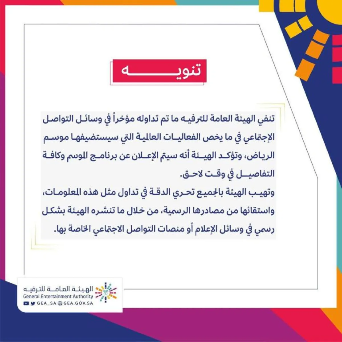 وأهابت الهيئة العامة للترفيه بالجميع بتحري الدقة في تداول مثل هذه المعلومات، واستقائها من مصادرها الرسمية، من خلال ما تنشره الهيئة بشكل رسمي في وسائل الإعلام أو منصات التواصل الاجتماعي الخاصة بها.