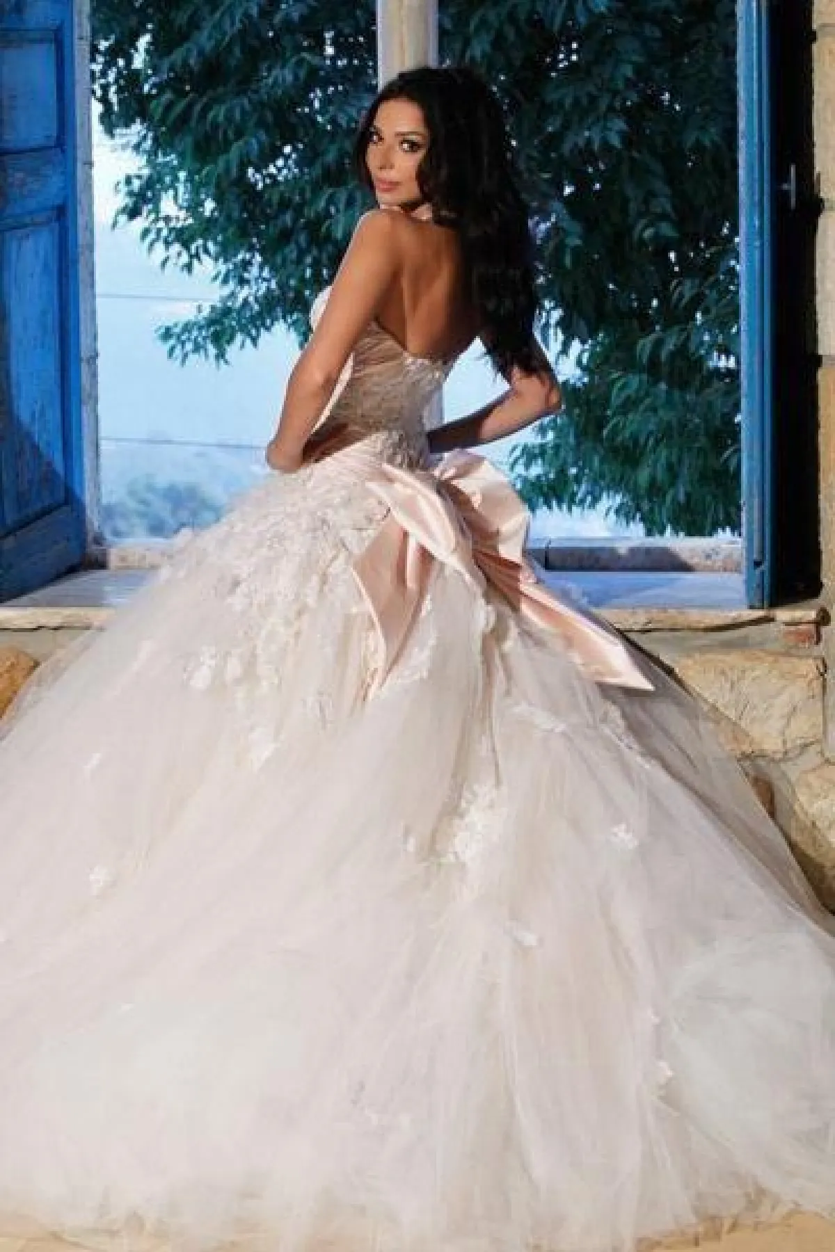 اتسم فستان زفاف نادين نسيب نجيم بالفخامة والإبهار، فهو بتصميم منفوش وبقبّة Heart، ومزين الورود البارزة.