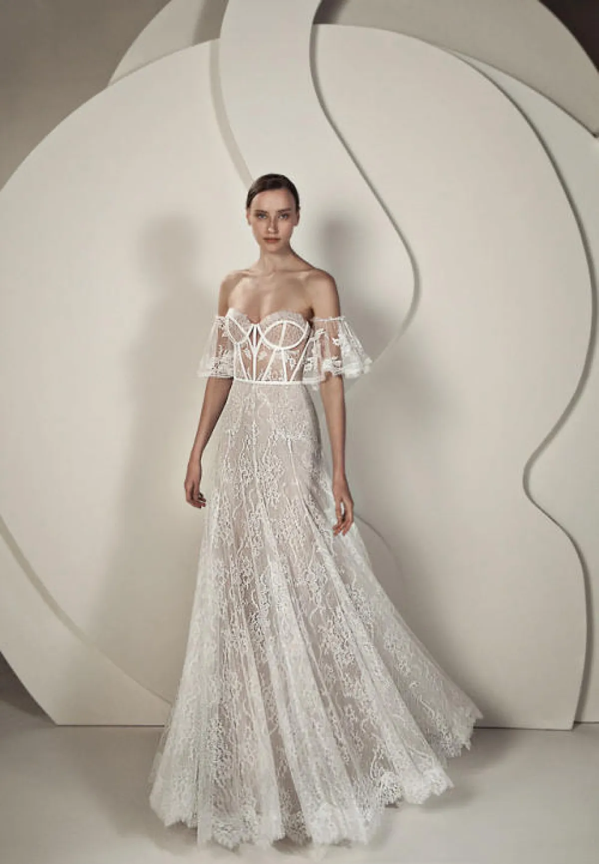 قدمت ماركة Alon Livné White فستان زفاف ناعم بقماش الدانتيل بقصّة أوف شولدر وتنورة واسعة لإطلالة عصرية راقية.