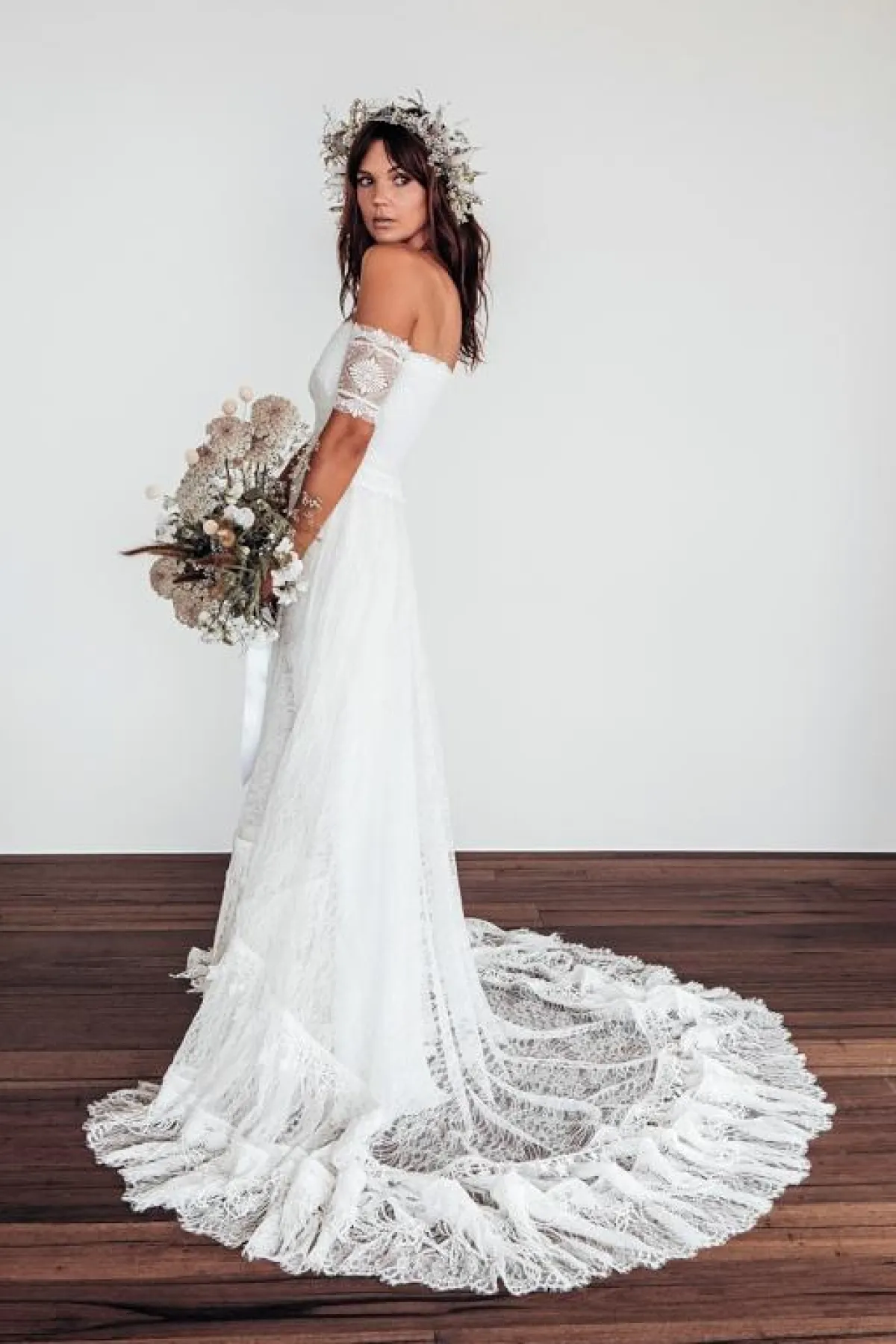 أحببنا فستان زفاف Grace love lace الدانتيل بتنورة واسعة وقصّة كاشفة للأكتاف بأكمام قصيرة، وبذيل ينسدل على الأرض بقماش الدانتيل.