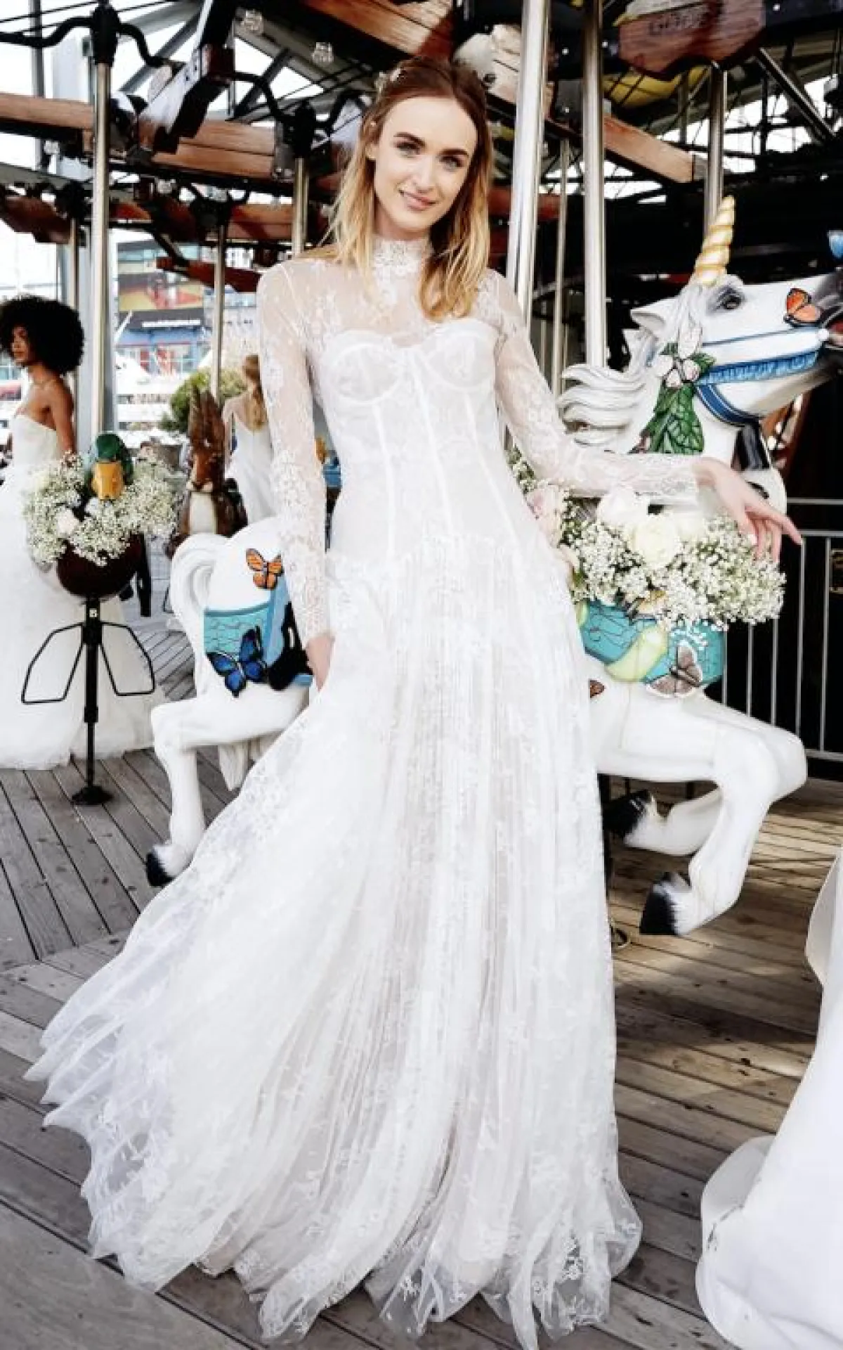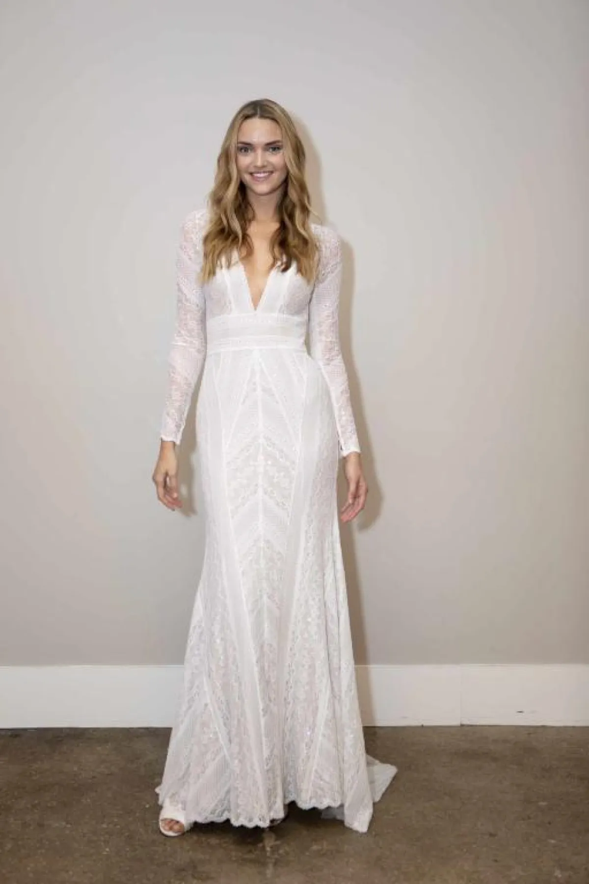 كما قدمت ماركة BHLDN فستان بسيط بقماش الدانتيل، وهو بأكمام طويلة وقبّة V مع تنورة بقصّة A Line تتسع من أسفل الصدر.