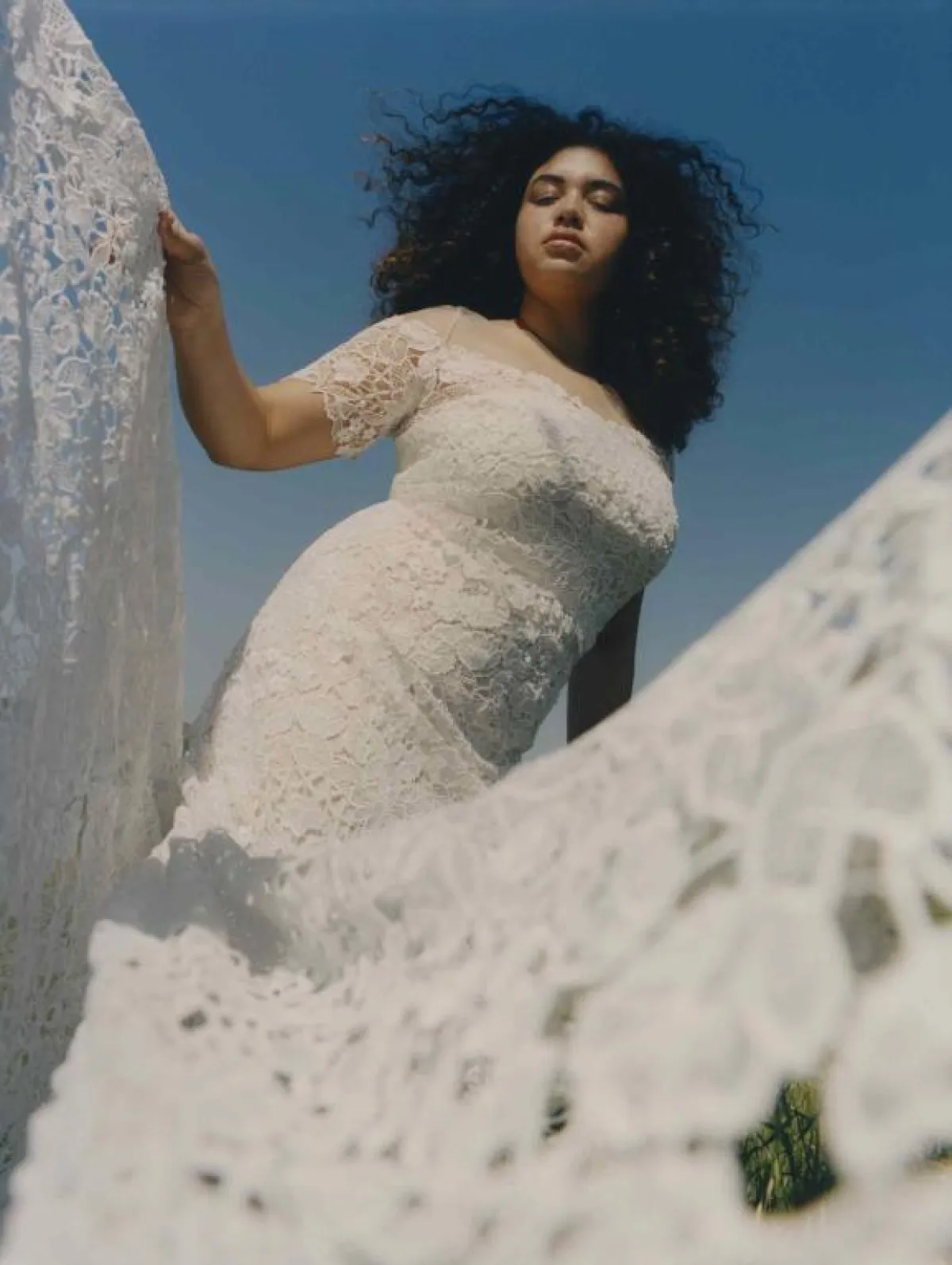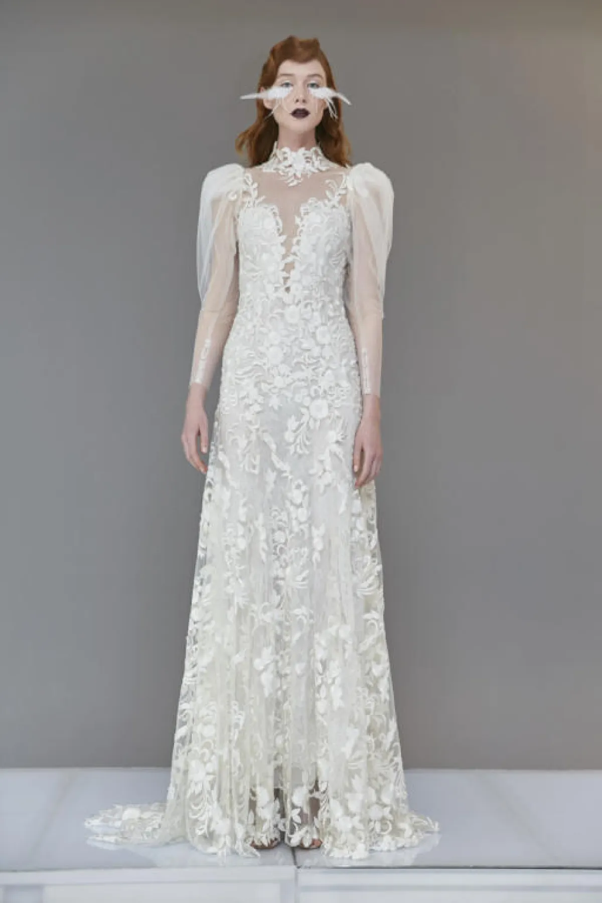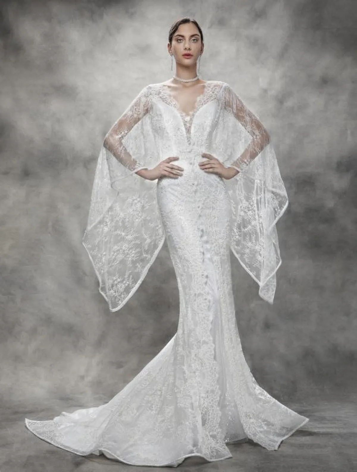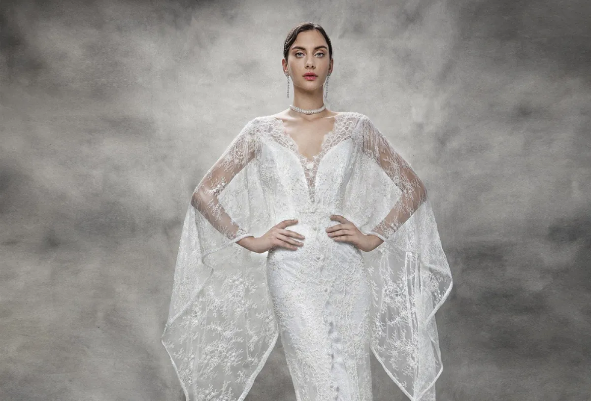 وقدمت ماركة Victoria KyriaKides فستان زفاف دانتيل بصيحة الكاب الرائجة، وهو بقصّة حورية البحر التي تبرز انحناءات الجسم.
