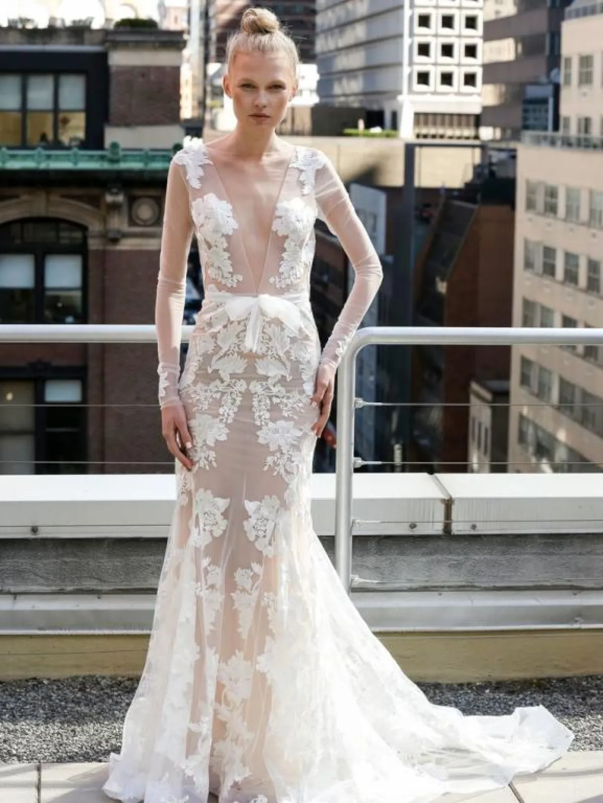 أيضاً قدمت ماركة Amsale فستان زفاف ناعم ومحتشم بقماش الدانتيل يناسب العروس المحجبة، حيث أنه بأكمام طويلة.