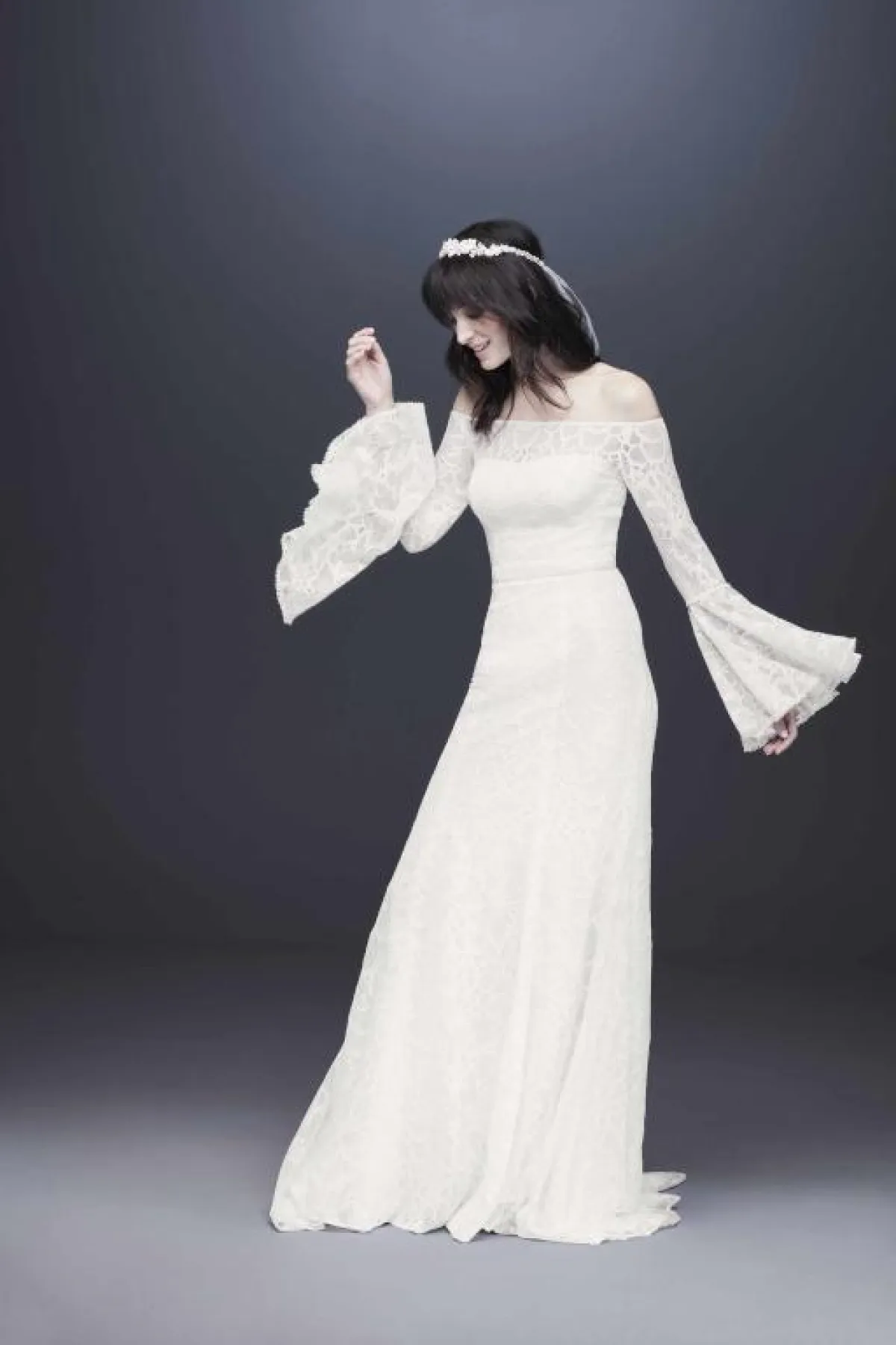 كذلك قدمت ماركة Galina by David's Bridal فستان زفاف كاشف للأكتاف بأكمام طويلة بصيحة الجرس وبتنورة A Line.