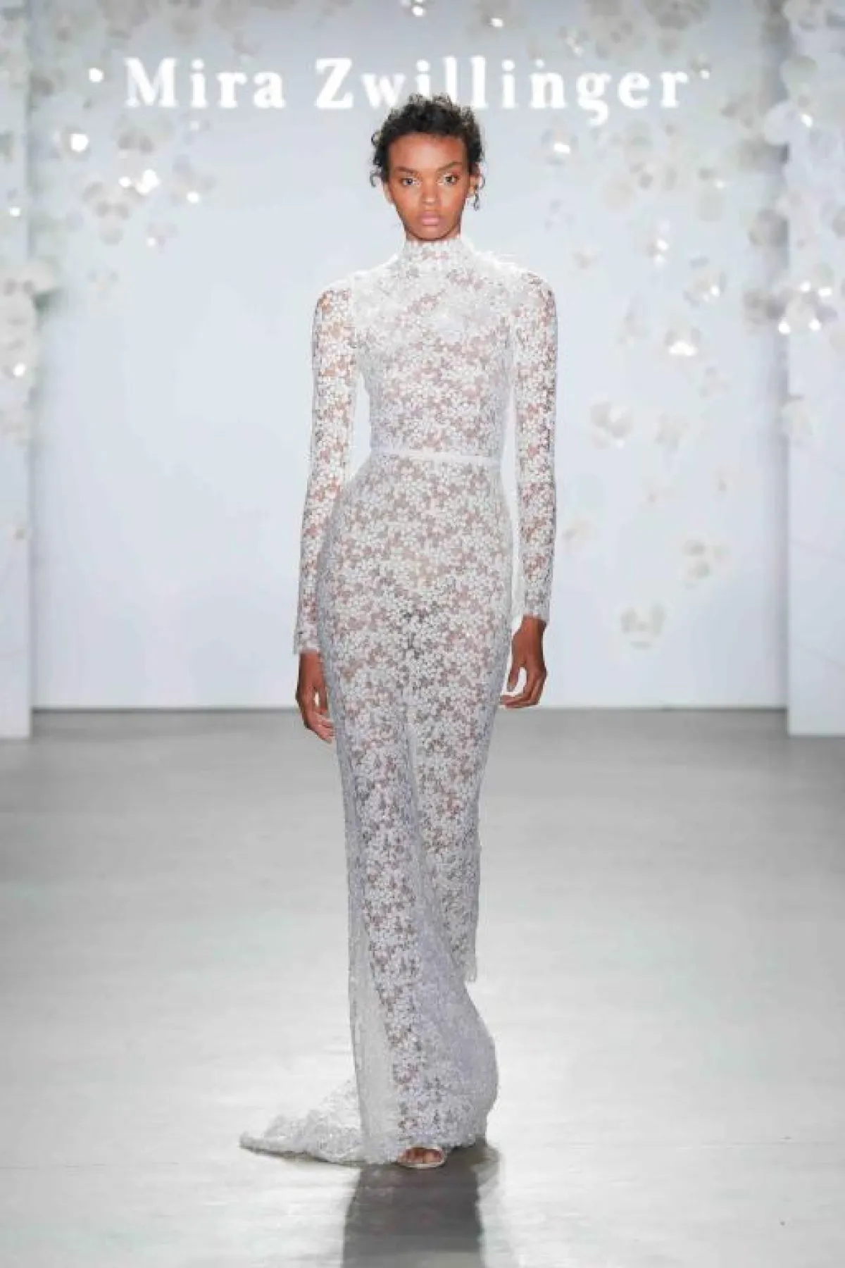 أعجبنا الفستان المحتشم بالقصّة العمودية من Mira Zwillinger، فهو بأكمام طويلة وقبّة مرتفعة مع ذيل قصير من الخلف.