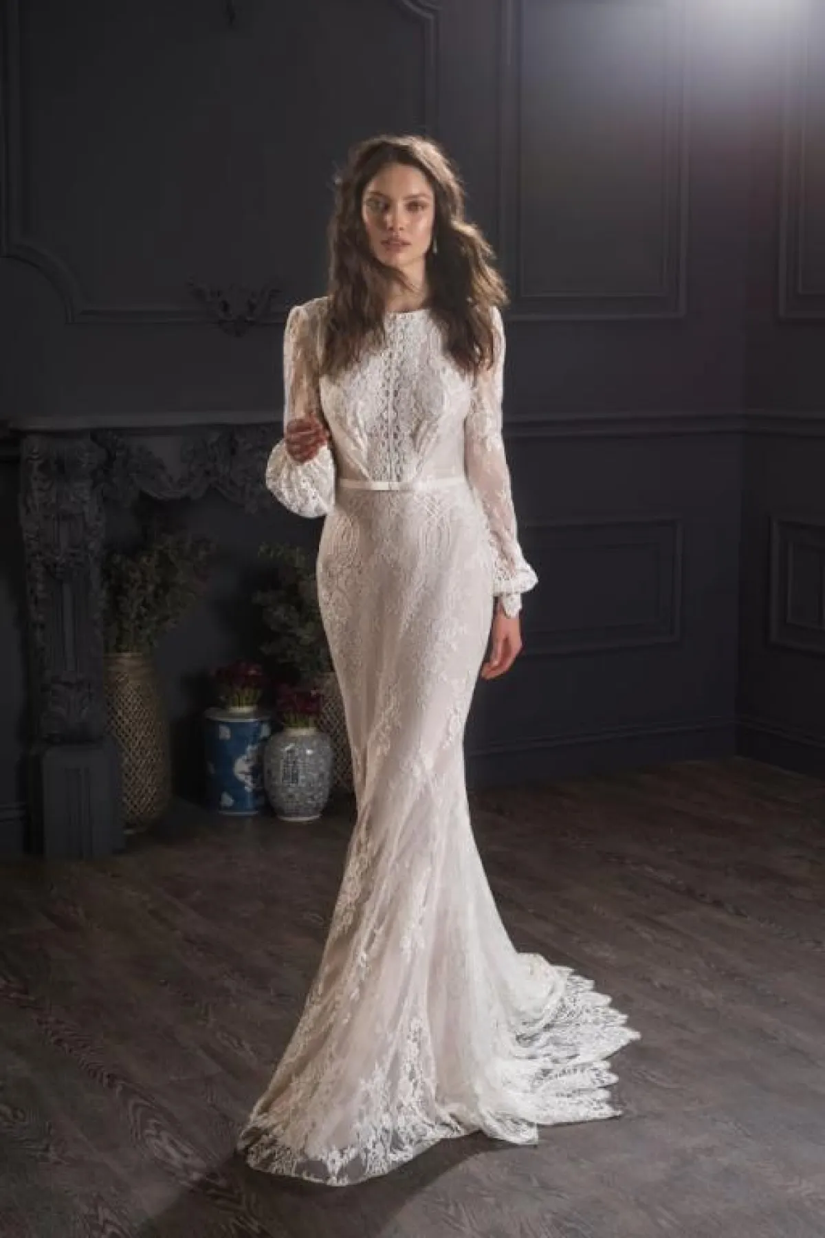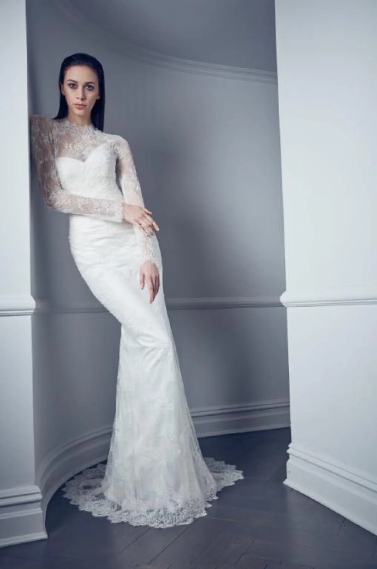 للعروس صاحبة القوام الممشوق، يمكن أن تختاري فستان زفاف دانتيل عمودي بأكمام طويلة وقبّة مرتفعة.