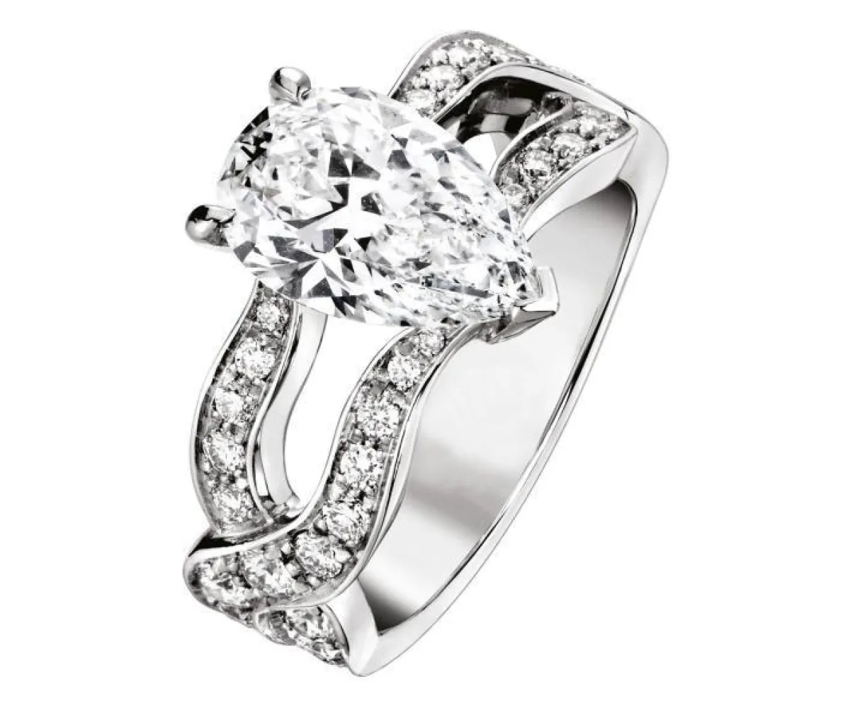 وأعجبنا الخواتم بالذهب الأبيض بتصميم الإجاصة من بياجيه Piaget، والمرصعة ببريق الألماس.