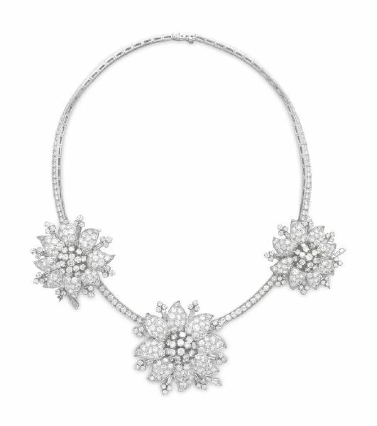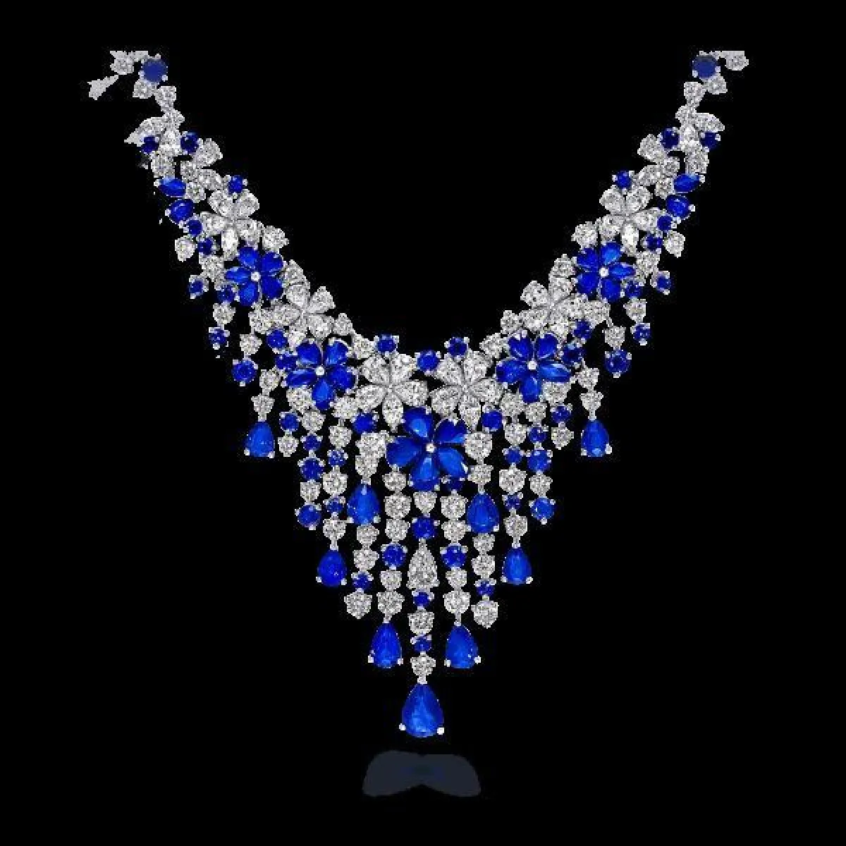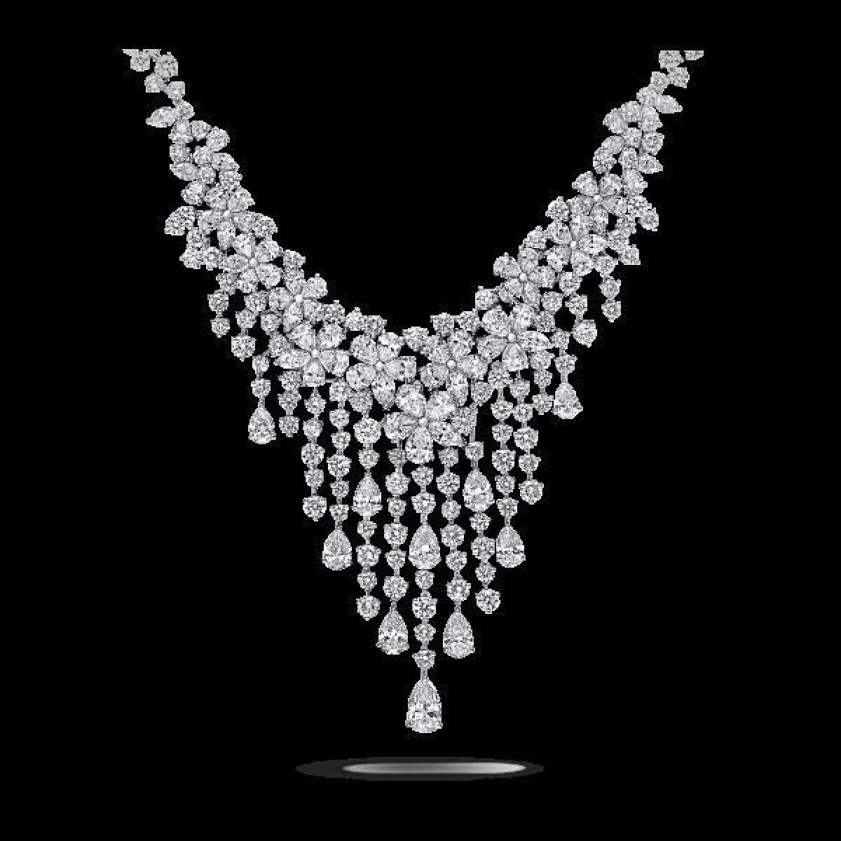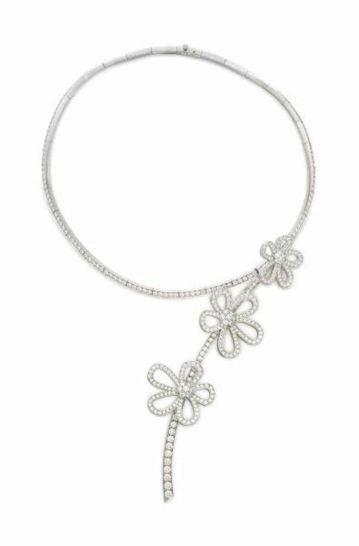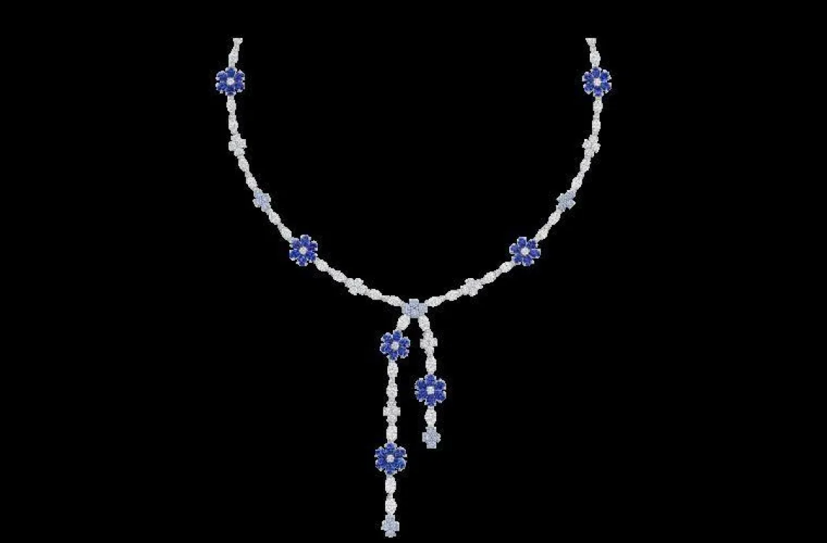 أما دار غراف Graff، فقدمت قلادات الورود الماسية الفخمة والمرصعة بالألماس، والتي تتدرج في طولها لتناسب الفستان بقبّة الـV، سواء بالماس الأبيض أو الفصوص الزرقاء.