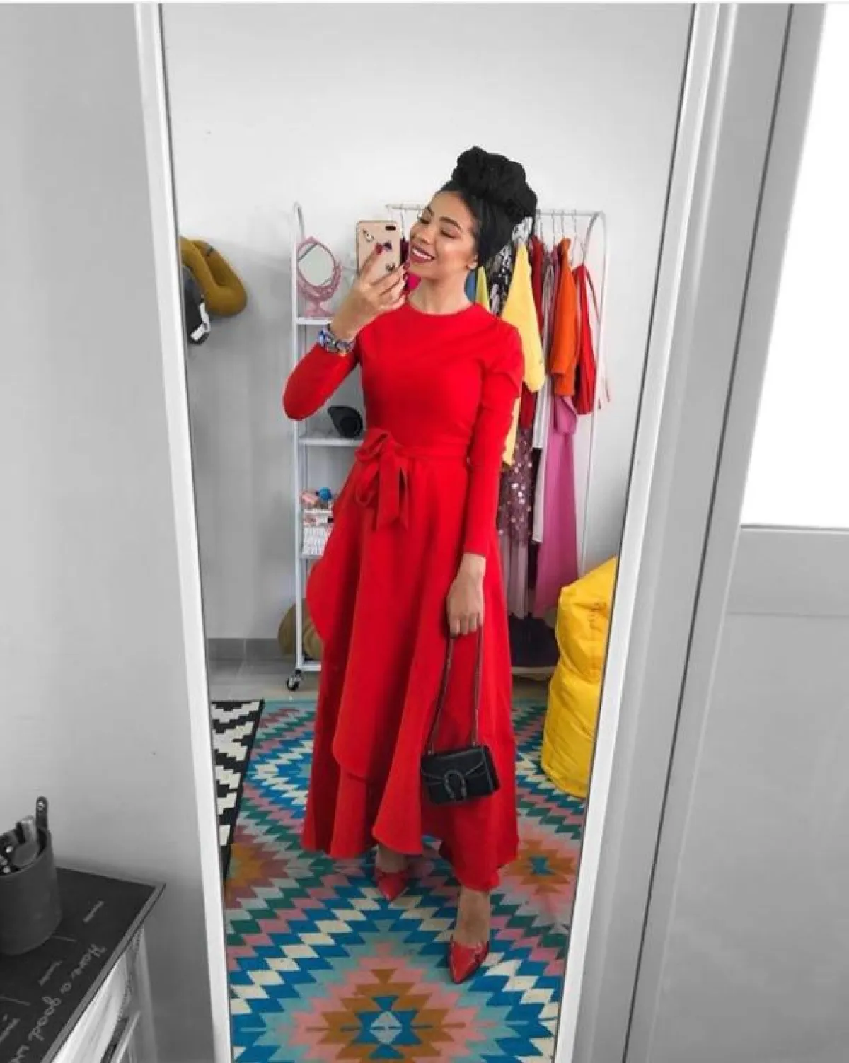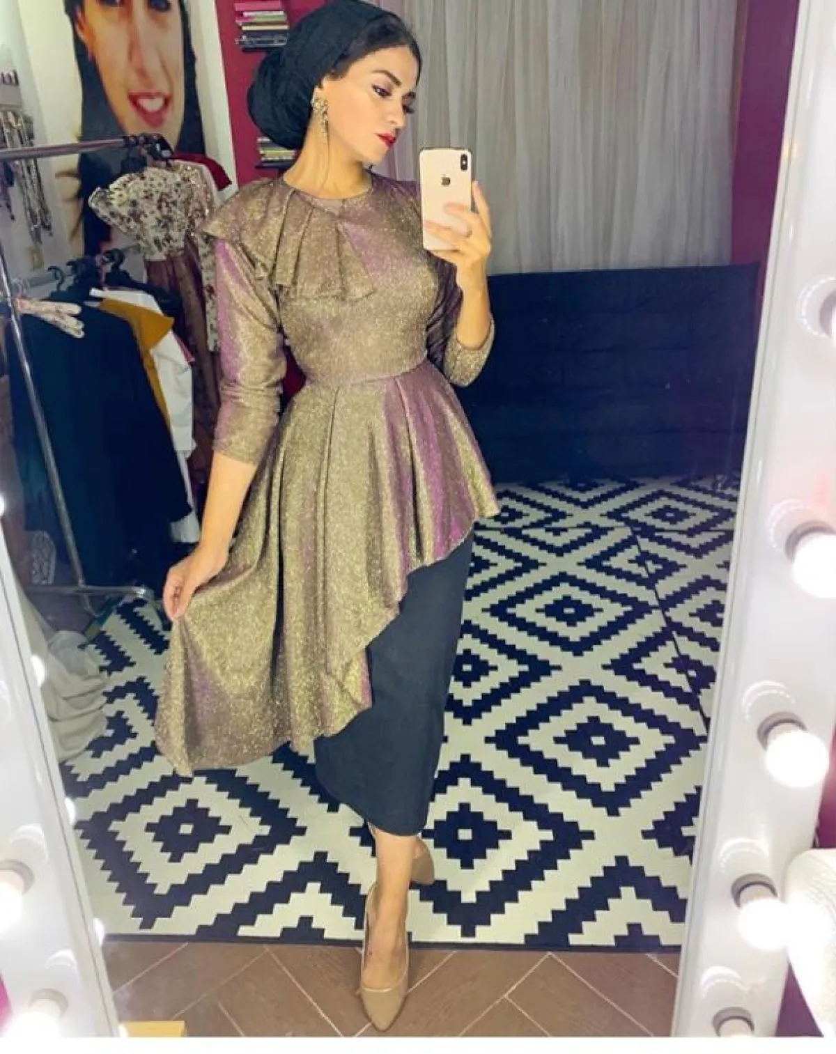 اما إن كنتِ تتمتعين بروح جريئة، فيمكنكِ اختيار التوربان مع الربطة العالية، كهذا اللوك من منة السوني، والأفضل أن تكون التوربان بألوان من درجات الفستان نفسه، حتى لا تبدي متكلفة للغاية مع الربطة اللافتة للأنظار.