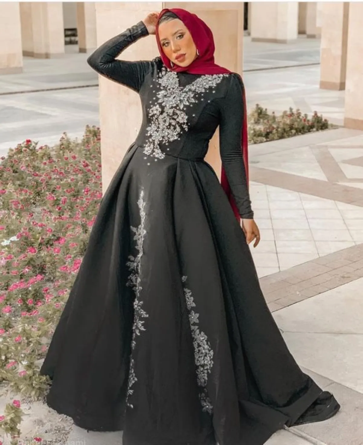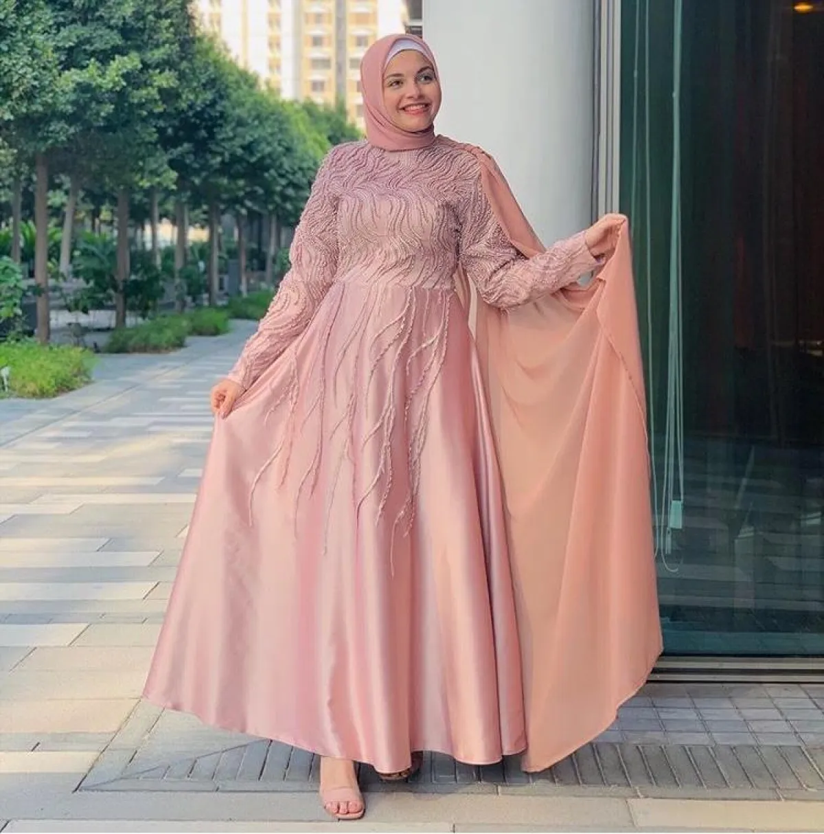 ويمكنكِ ربط الحجاب الساتان من المنتصف من دون ثنيه، ومع لفه حول الرأس، ووضع الأطراف داخل الفستان، وتثبيت الحجاب بدبابيس سرية.