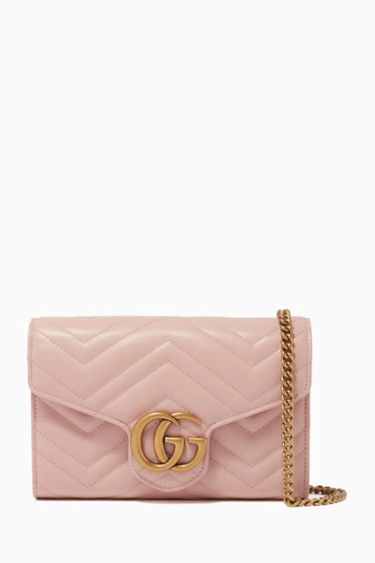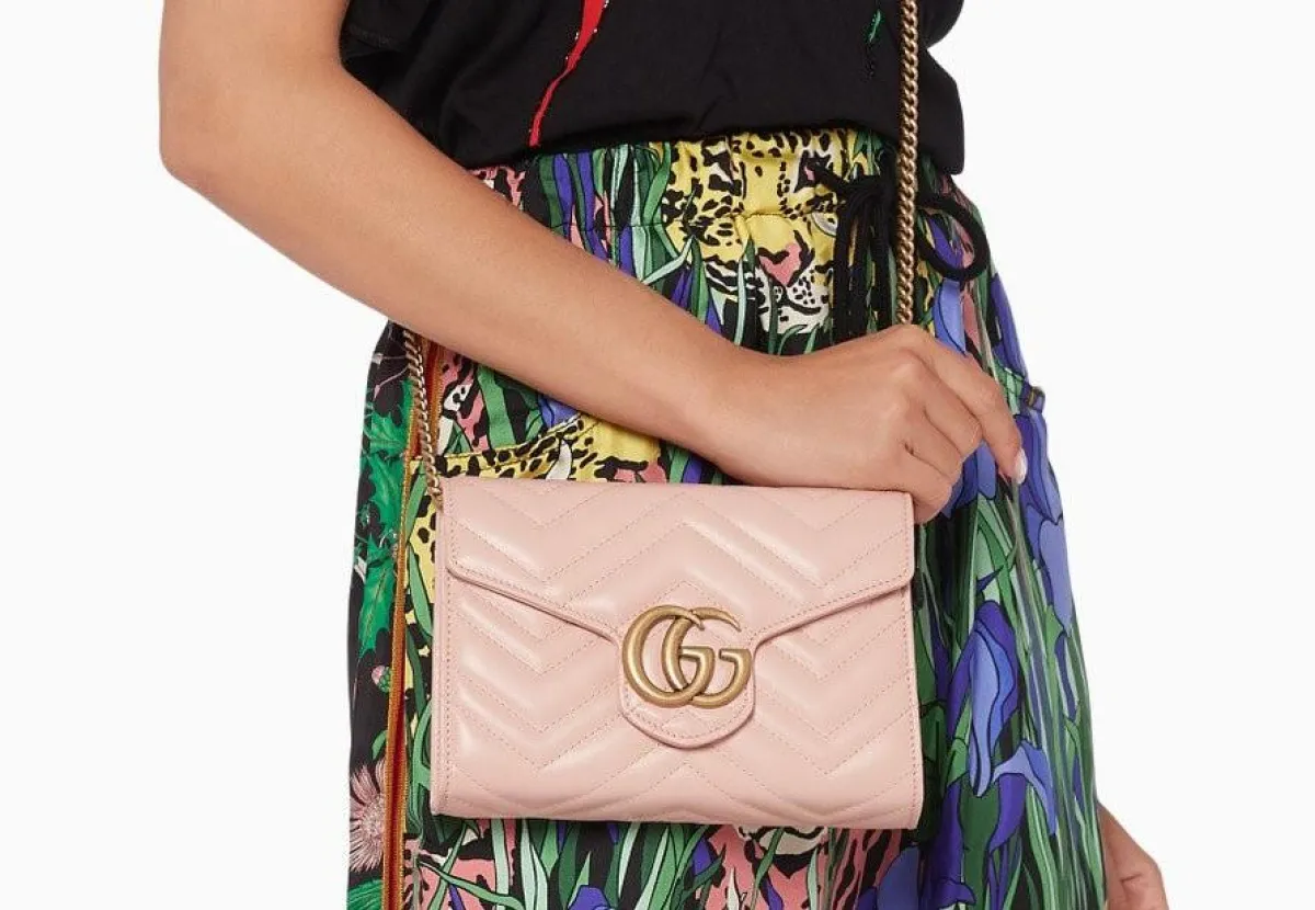 ولكي لا تحتاري، اخترنا لك هذه الحقيبة باللون الوردي الجذاب من Gucci المميزة بتصميمها البسيط وبشعار Gucci الذهبيّ.