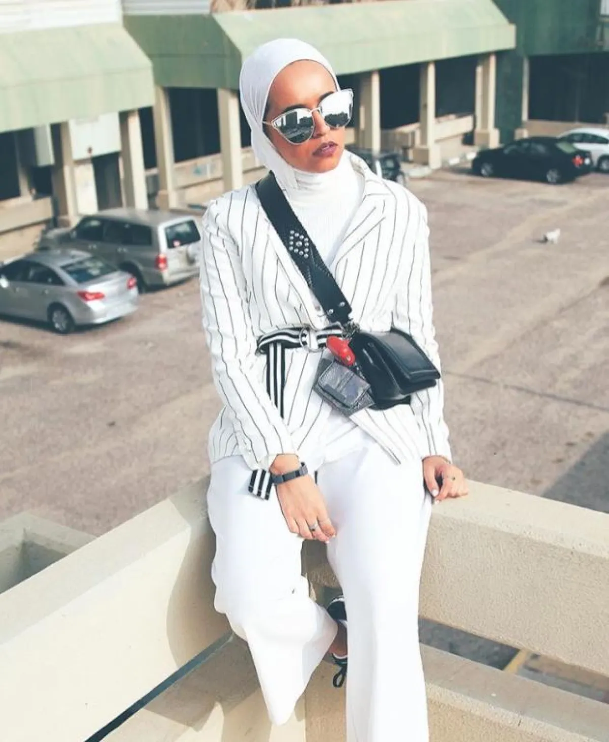 من القطع التي أحببناها على لولوه الخطاف، هو البليزر الأبيض المخطط، وهو قطعة أنيقة تمنحكِ اطلالة متوهجة، وتُبرز سمرة بشرتكِ الجميلة، وبالوقت نفسه أنيق ومحتشم، من الممكن أن تنسقيه على طريقة لولوه، مع البنطلون الأبيض والطرحة بالدرجة نفسها، لاطلالة محايدة وكاجوال.