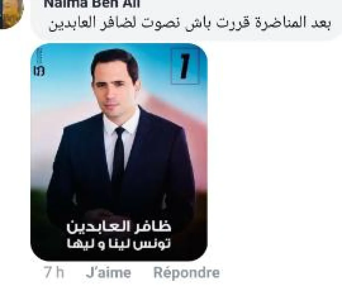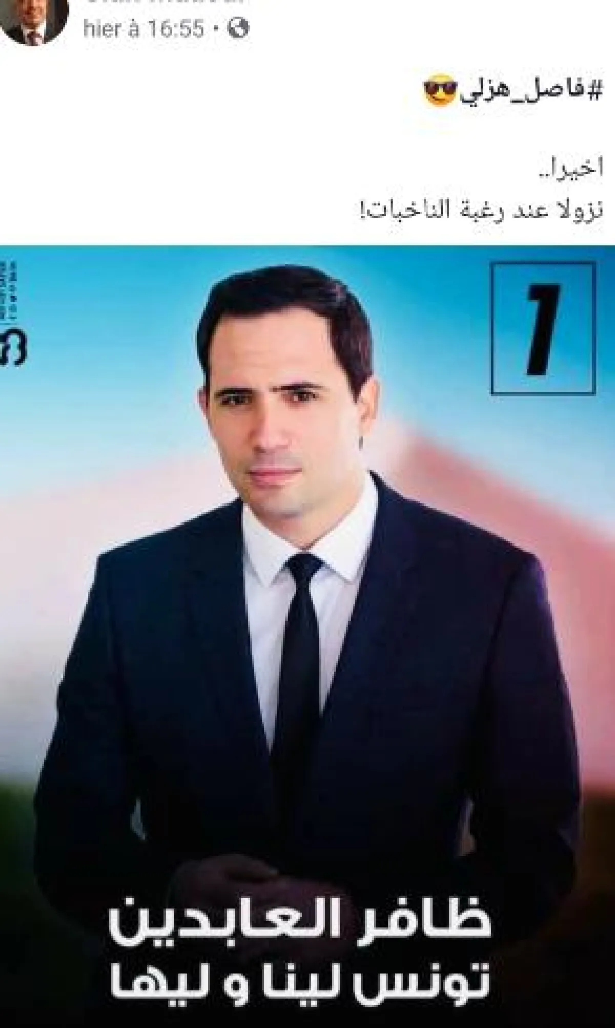 و تفاعلا مع أجواء الحملة الانتخابيّة الرئاسيّة في تونس ذهبت بعض التعليقات الطريفة أيضا إلى مناشدة ظافر العابدين للترشّح للرئاسة و كتب البعض مازحا" ظافر رئيس " مؤكّدين أنّهم سينتخبونه دون تردّد و بلغ الأمر حدّ تصميم معلّقة على غرار معلّقات المترشحين للانتخابات تحمل صورة ظافر العابدين و عليها رقم 1 و تحمل شعار "ظافر العابدين ...تونس لينا و ليها"،و لاقت هذه المعلّقة الطريفة تجاوبا من مستعملي صفحات التواصل الاجتماعي الذين ساندوها.