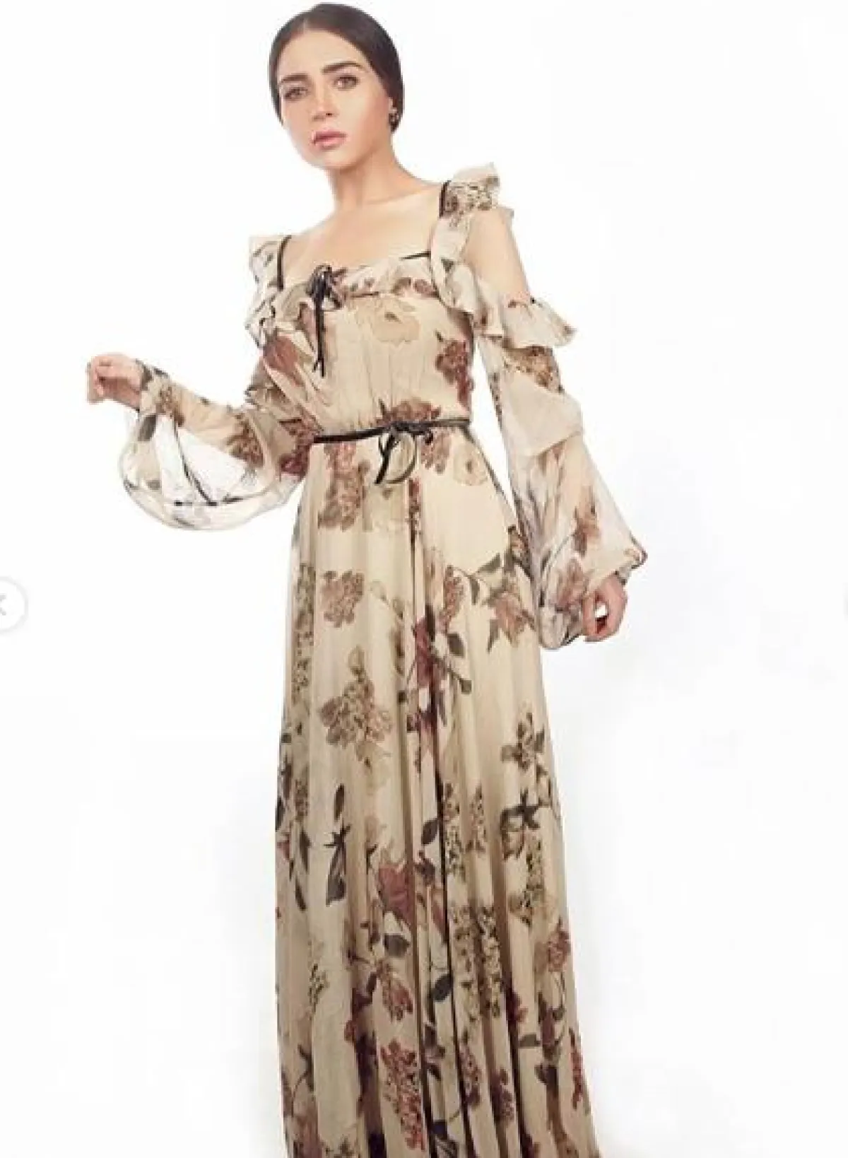 تليق الاطلالات الرومانسية بـ مي عز الدين، حيث إنها تتمتع بجمال ناعم وبريء، وقد شاهدنا مؤخرًا وقد اعتمدت اطلالة ذات طابع رومانسي عبارة عن فستان ماكسي باللون البيج معرق بالورود، مزين بالكشكش بطريقة ناعمة، ومكشوف الأكتاف ومزين بحزام قماشي على الخصر.