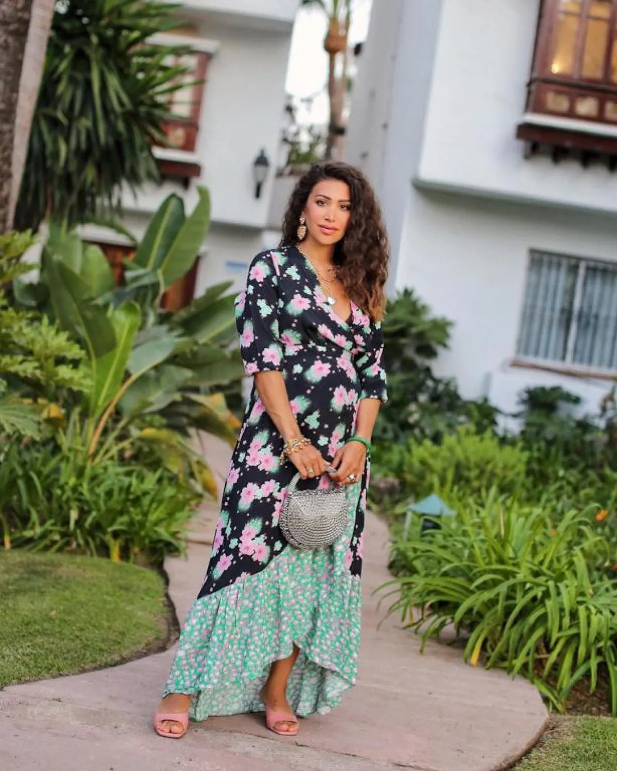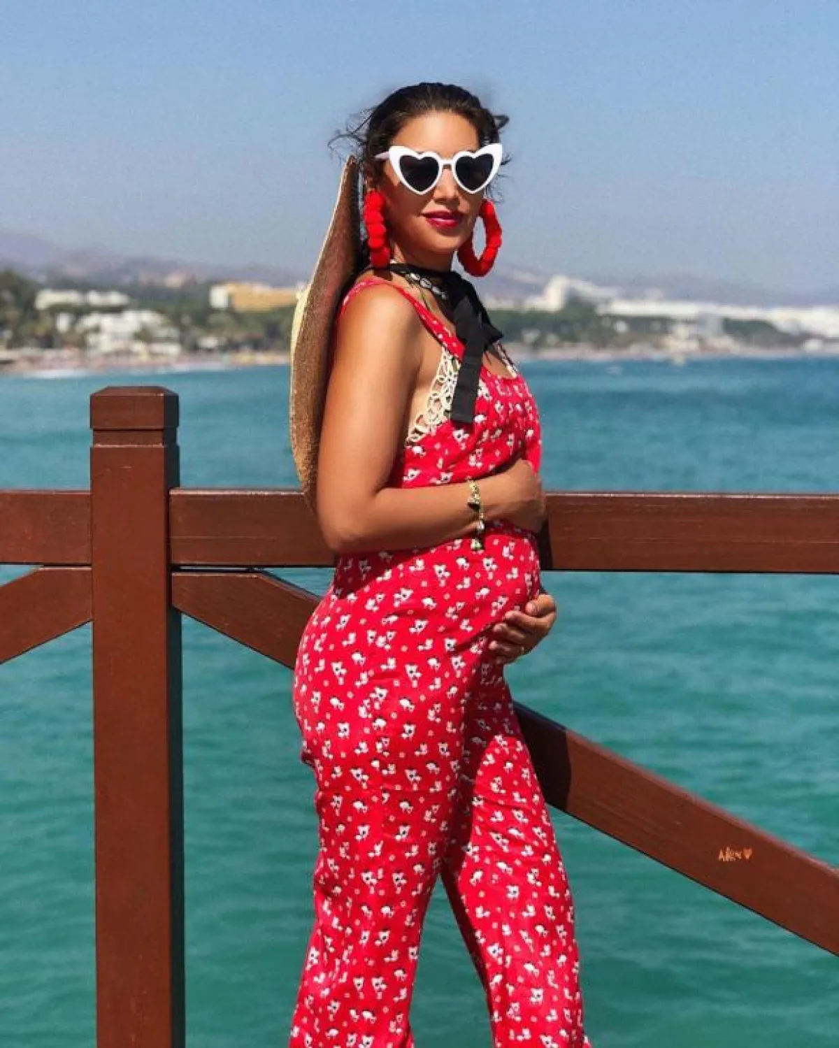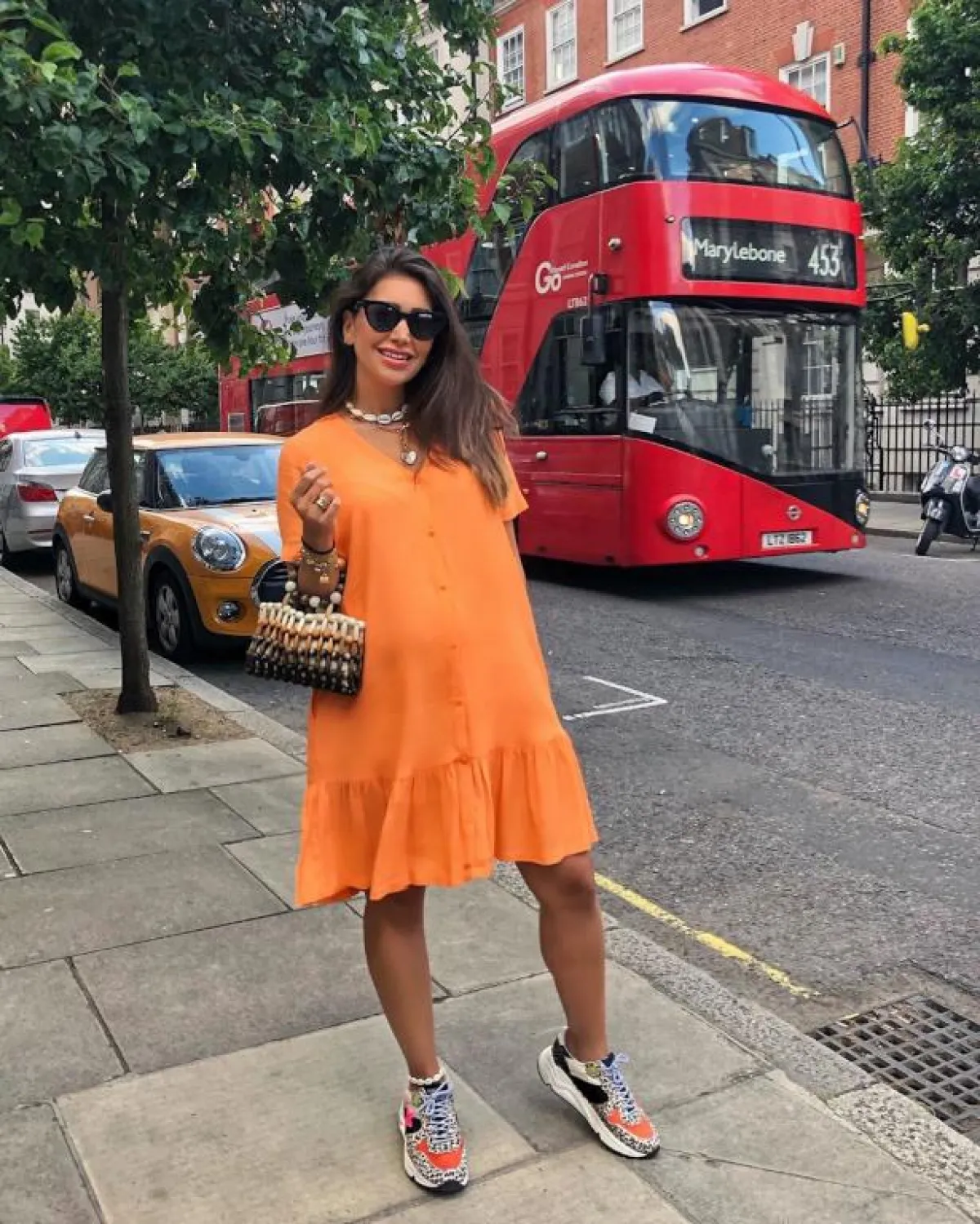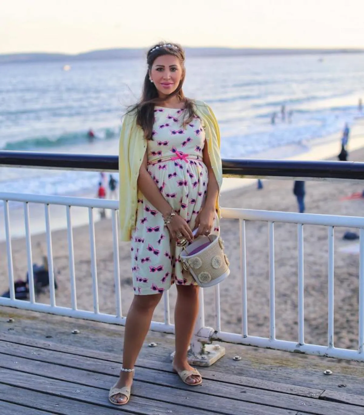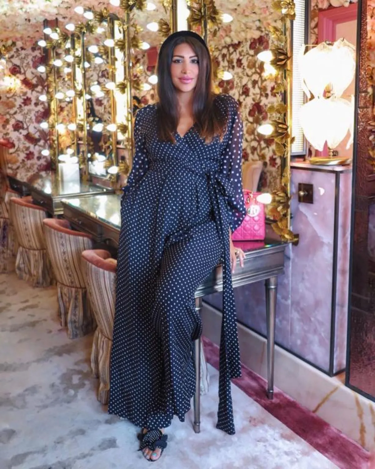 اعتمدت المدونة العراقية مايا وليامز جمبسوت بفتحة صدر ممتدة مع قصة الأكتاف الفضفاضة، جميعها تفاصيل جاءت مناسبة لامرأة حامل في شهور متقدمة.
