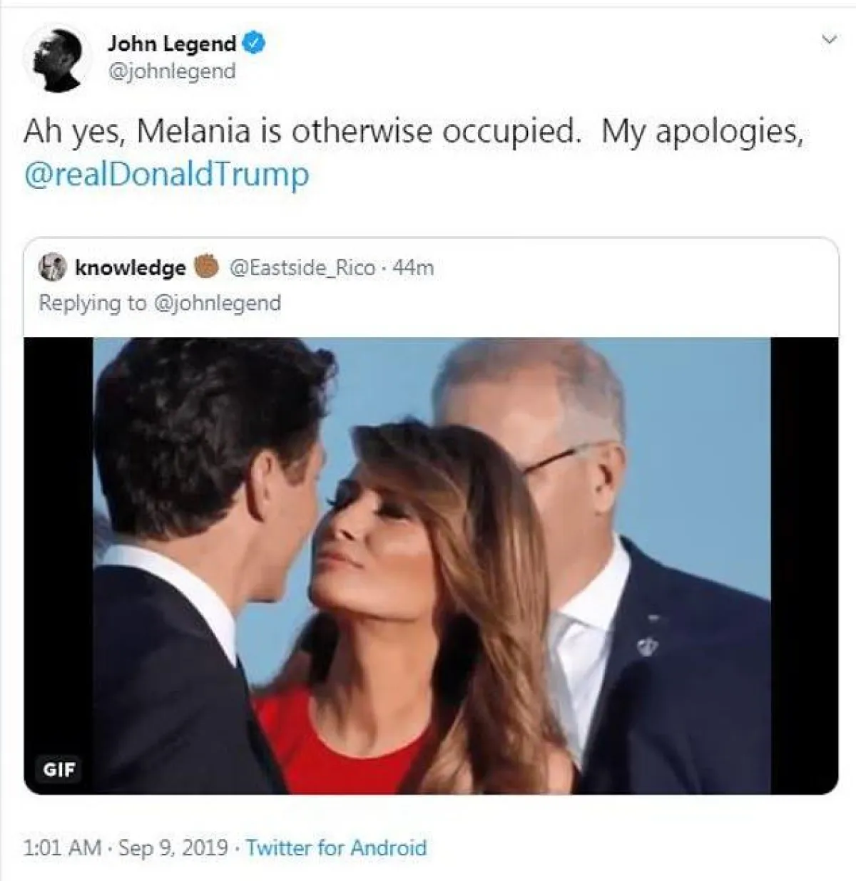 بدوره لم يكن المغني الأمريكي جون ليجيند أقل حدّة من زوجته، حيث كتب على “تويتر”: “تخيل أن تكون رئيسًا لبلد بأكمله، وتقضي ليلة كاملة على أمل أن يثني عليك شخص ما، ميلانيا، من فضلك اِمدحي الرجل، إنه يحتاجكِ”، ولكنه لم يتوقف عند ذلك، بل نشر صورة لميلانيا ترامب زوجة الرئيس الأمريكي مع جوستين ترودو رئيس وزراء كندا ساخرًا.