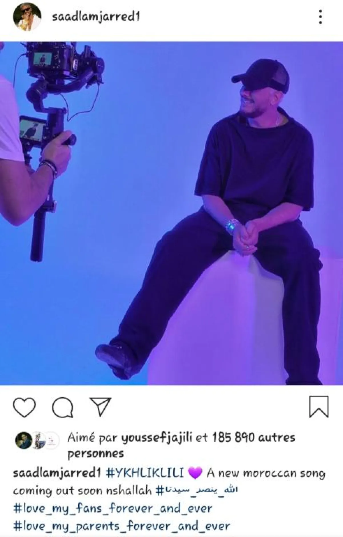 وشارك المجرد عبر صفحته الخاصة بموقع الصور والفيديوهات "الإنستقرام"، صورة له من كواليس تصوير العمل، وأرفقها بتعليق جاء فيه: "يخليك ليلي.. أغنية جديدة باللهجة المغربية.. قريبا".