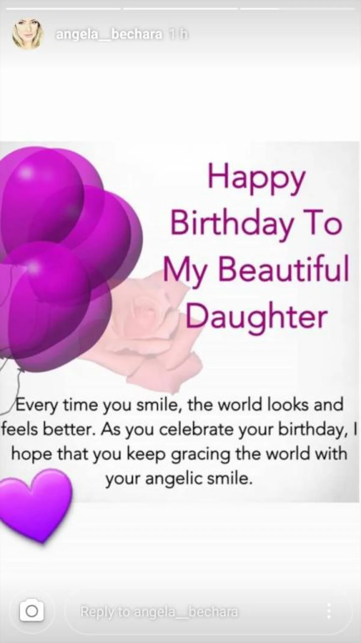 وتمنت أنجيلا بشارة لطفلتها ميشيل السعادة والفرح، مشيرة إلى أن ضحكتها تجعل العالم يبدو في حال أفضل.