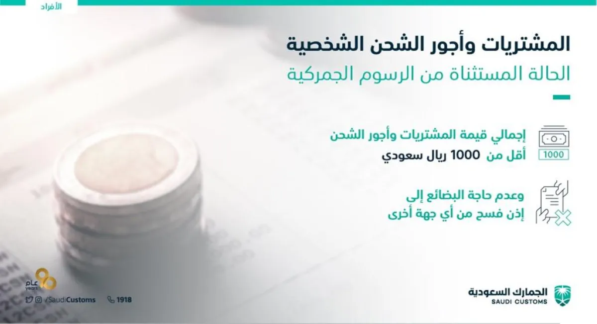 نشرت الجمارك السعودية عبر حسابها على موقع التواصل الاجتماعي «تويتر» انفوجراف أوضحت من خلاله الحالات التي تُعفى فيها المشتريات الشخصية التي يتم شراؤها عبر المتاجر الإلكترونية من الرسوم الجمركية.