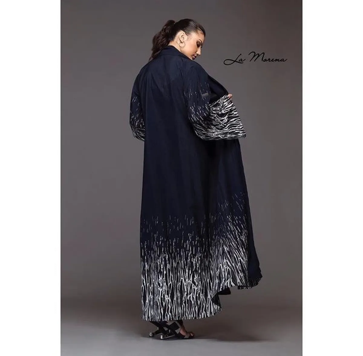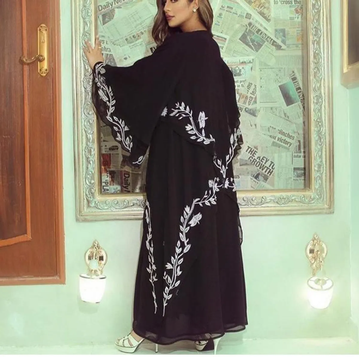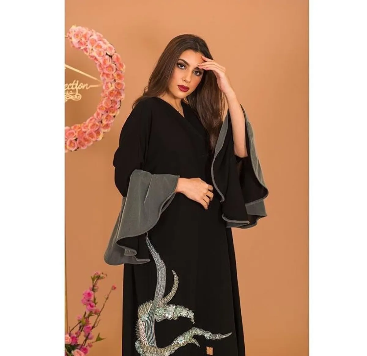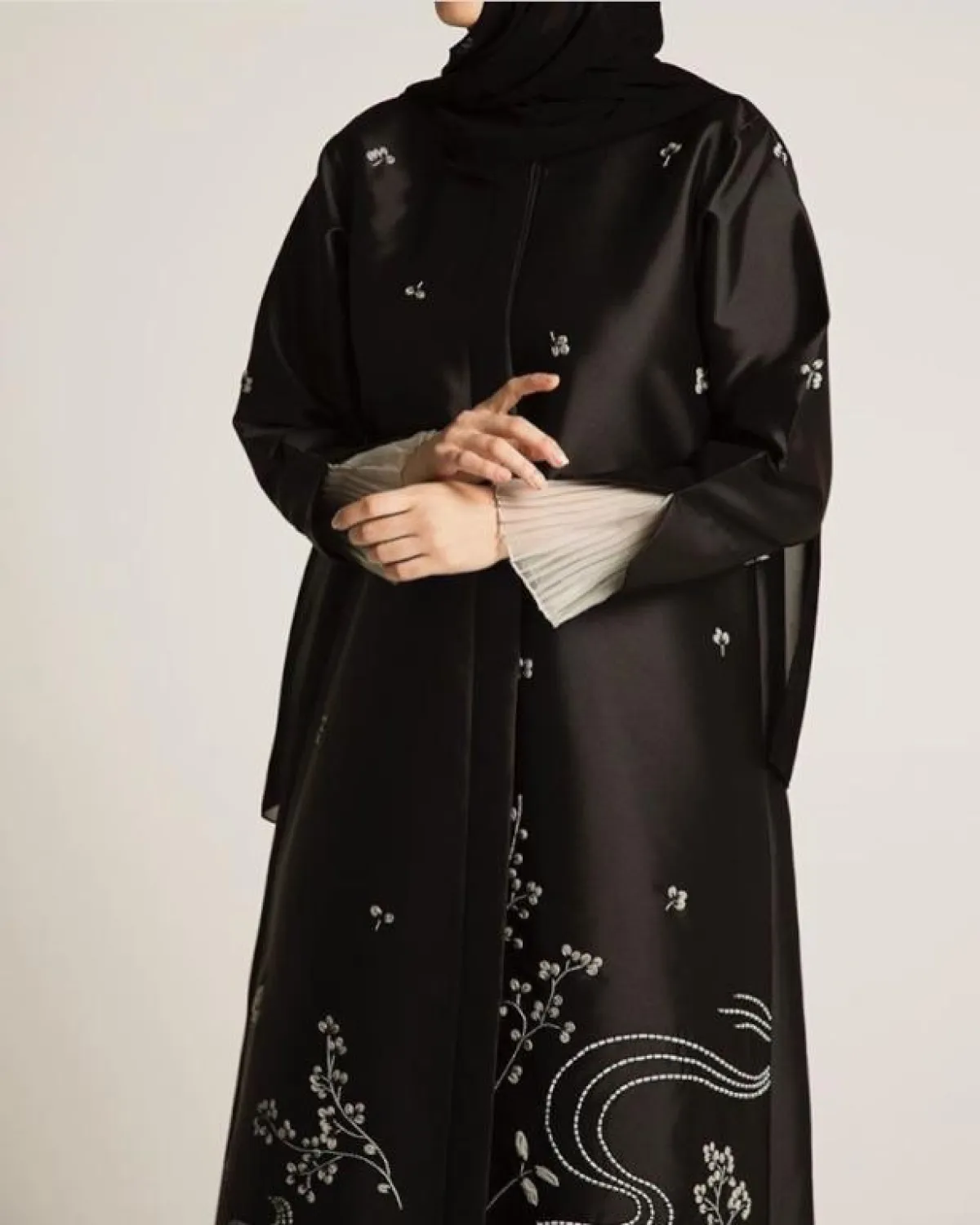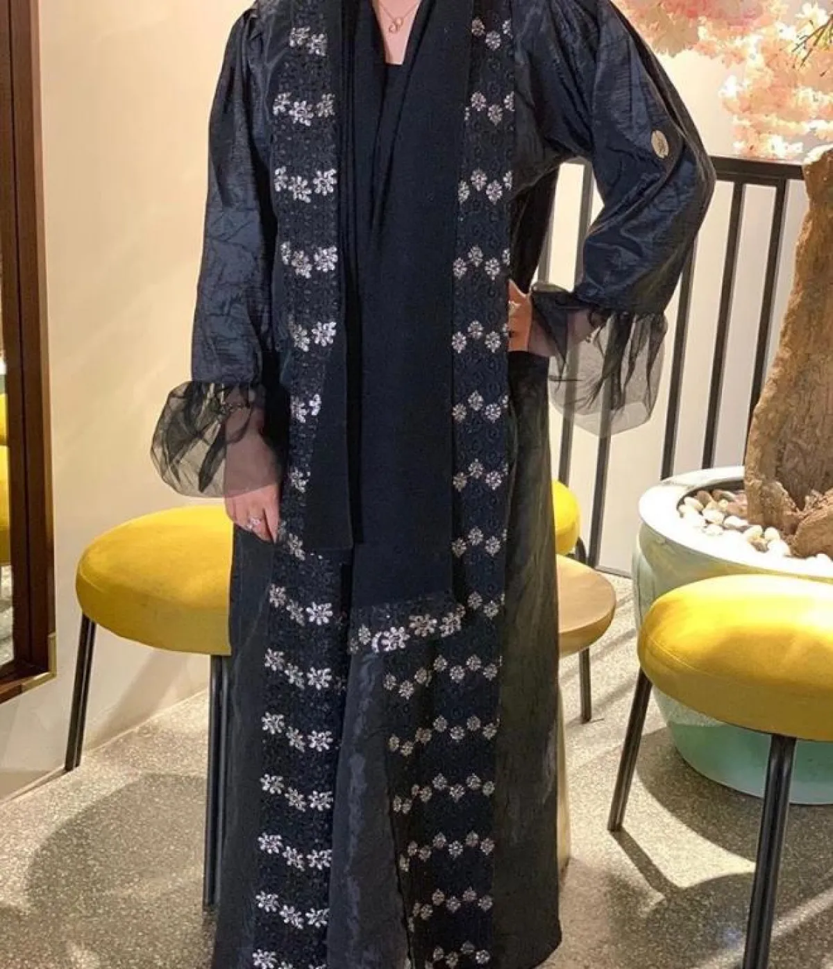 العبايه بتصميم أنيق باللون الأسود مع تطريزات على الأكمام، تنتهي بلمسة من القماش اللامع باللون الفضي، مناسبة للصبايا الثلاثينيات، تمنحهنّ اطلالة كلاسيكية مترفة.