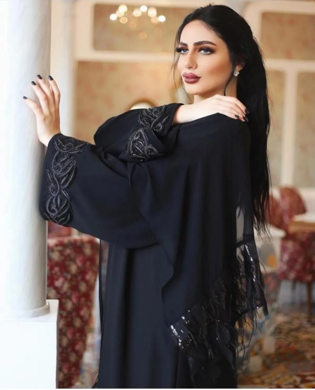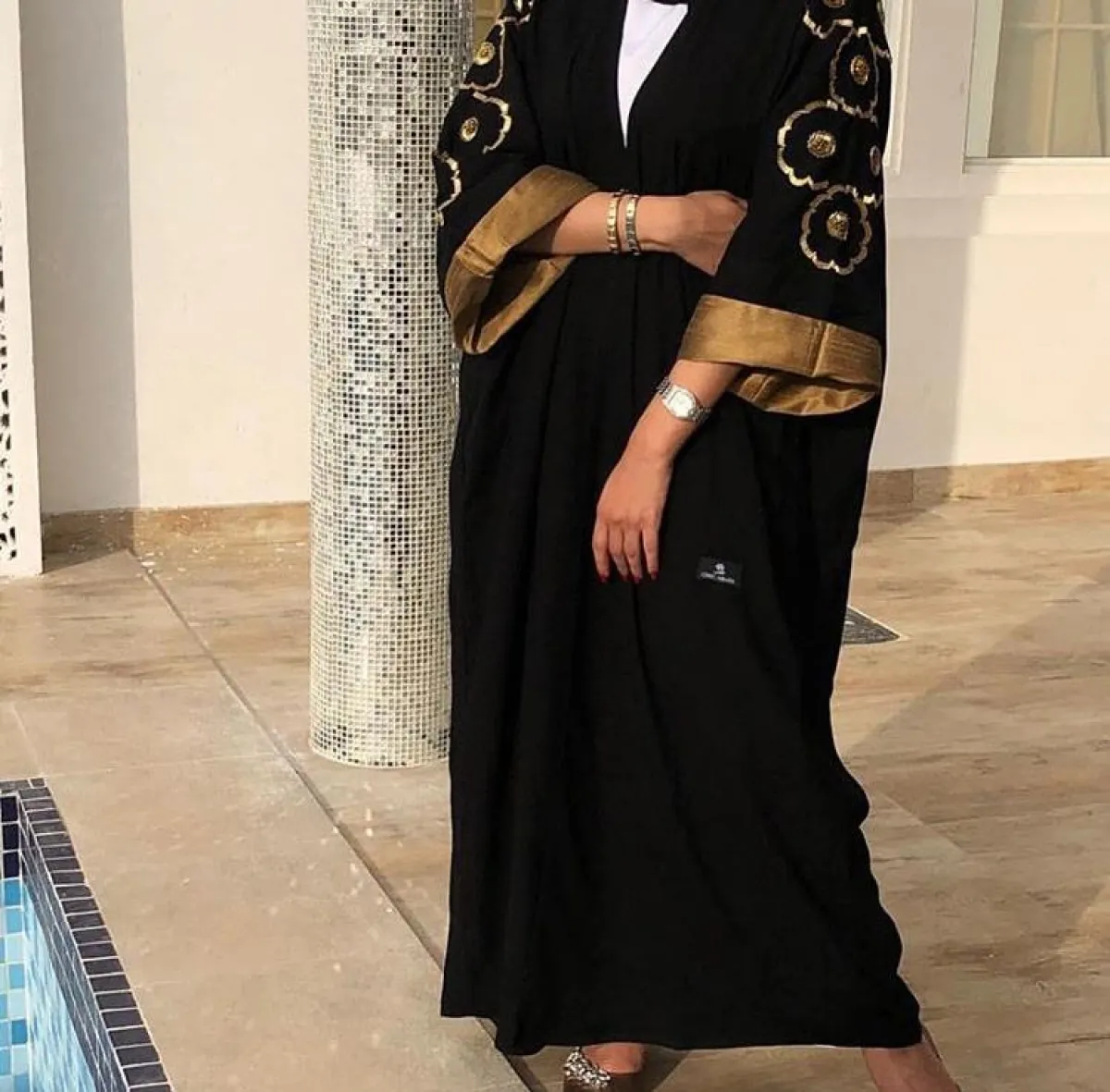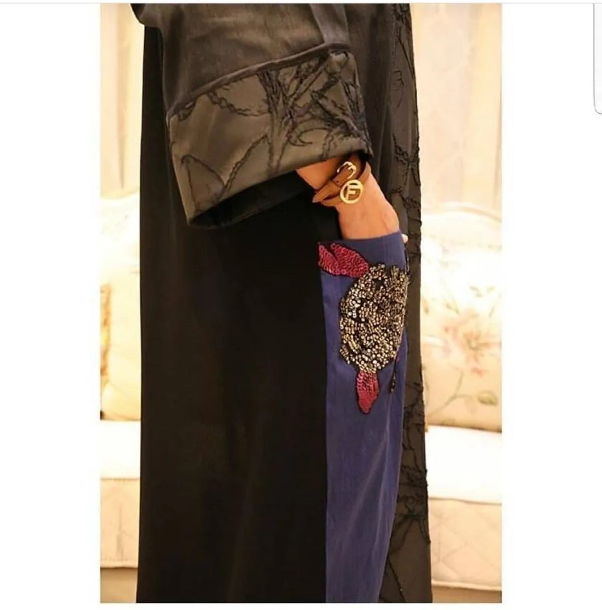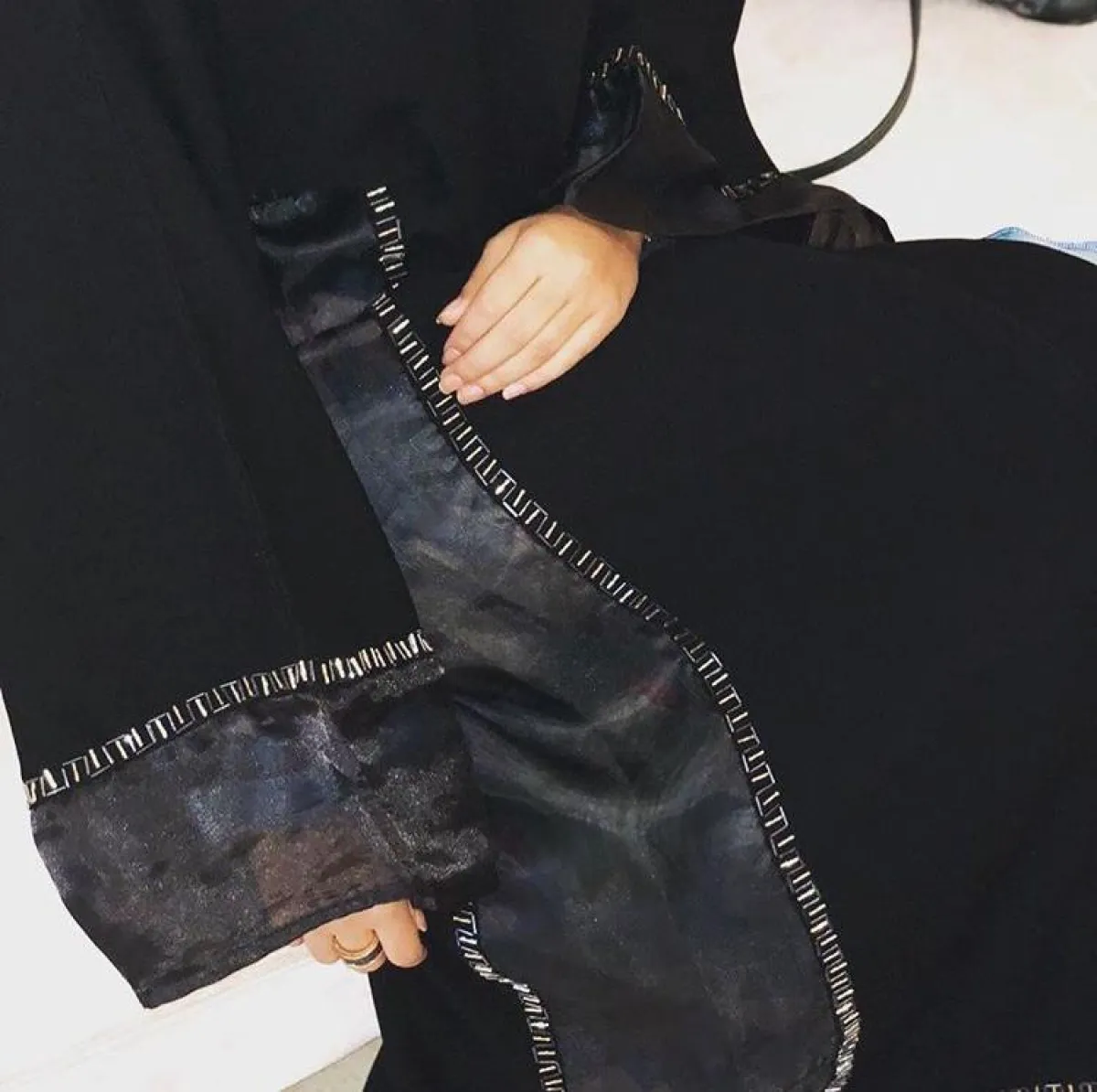 الأكمام المطرزة بأطراف ملونة مع العبايه السوداء