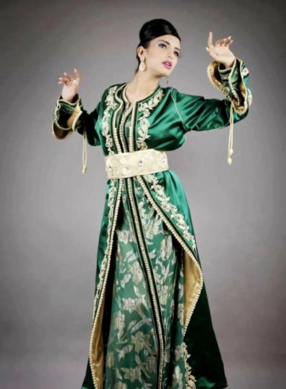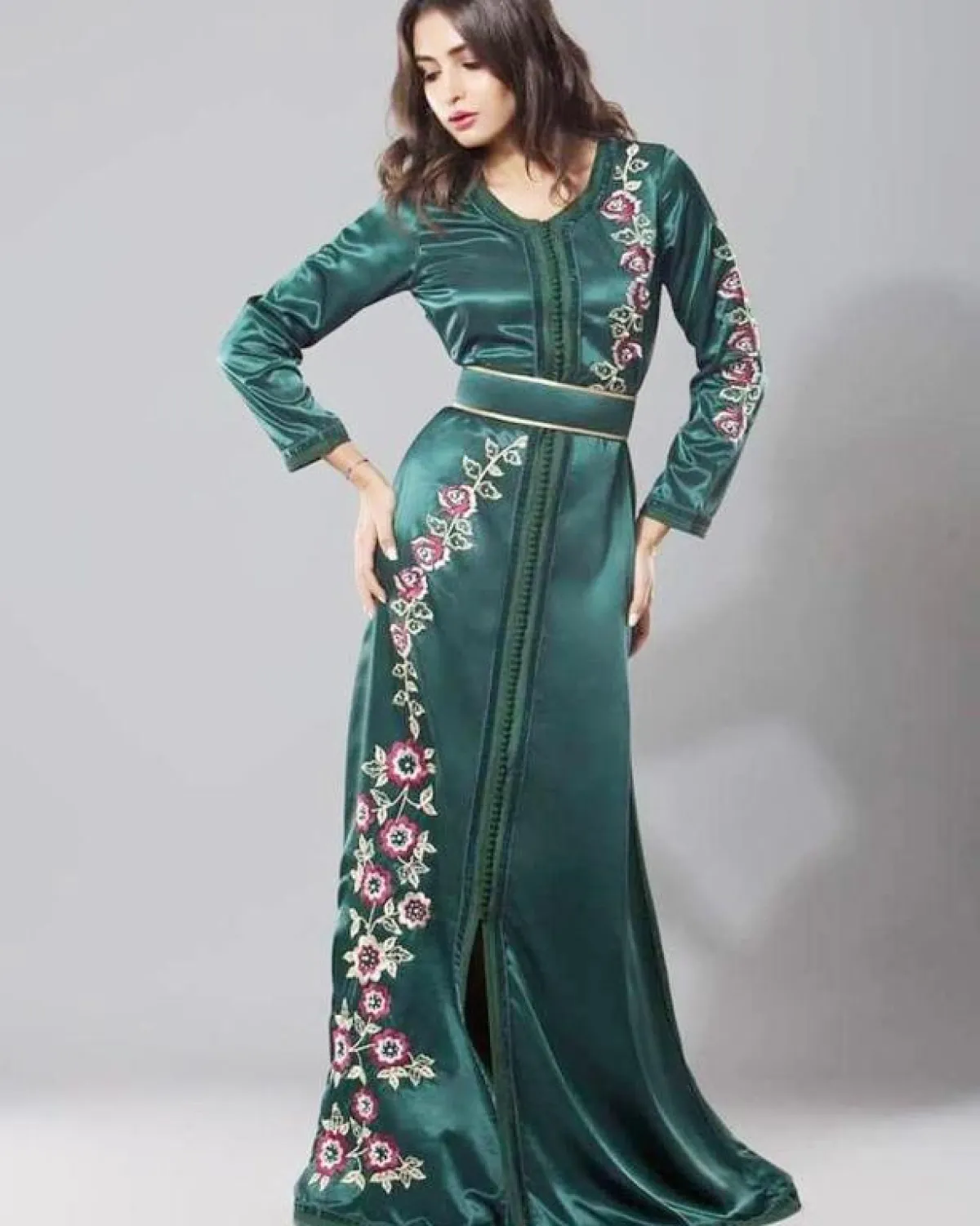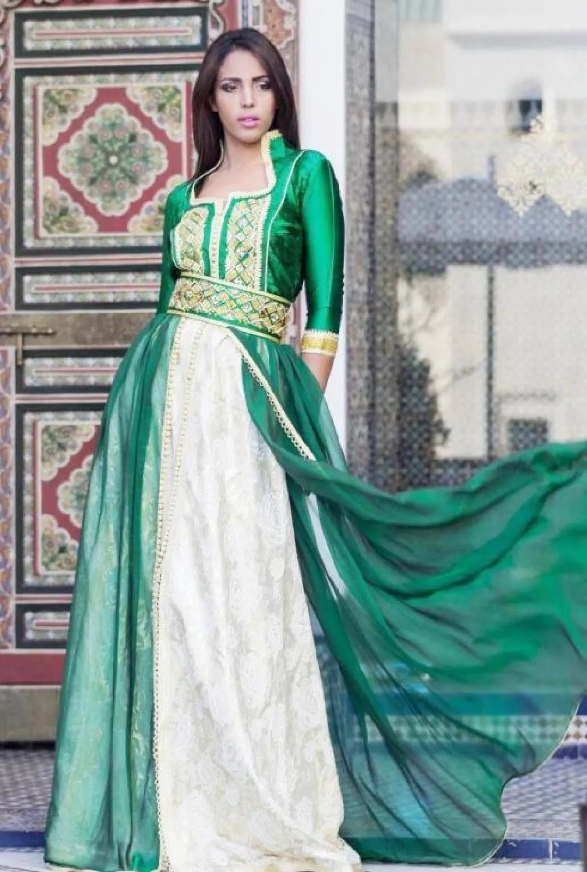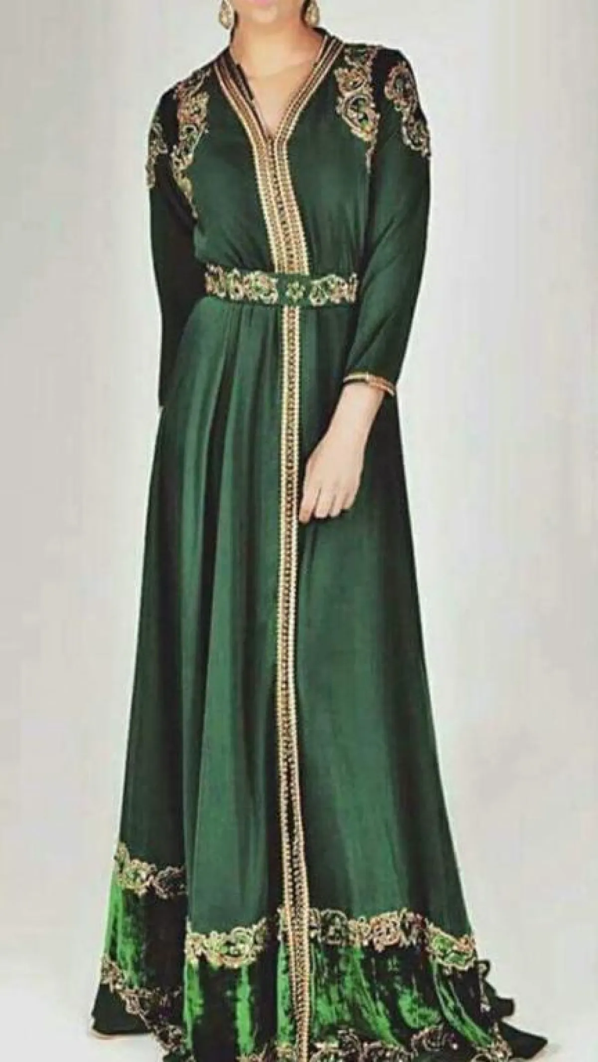 لإطلالة أنثوية ناعمة اخترنا لكِ قفطانًا أخضر بخطوط سوداء وزهور صفراء ضخمة، أو قفطانًا أخضر بدرجة داكنة منقوشًا بزهور حمراء مع حزام خصر، وكذلك قفطانًا أخضر بزهور ذهبية وحزام خصر ذهبي ضخم، ومن الممكن أن ترتدي قفطانًا بتصميم مختلف باللون اللبني المطرز بالذهبي ومُزيَّن بقماش أخضر في عدة مناطق، أو قفطانًا أخضر مُطرزًا بالذهبي ويزينه قماش سكري في الأسفل، وكذلك يمكن أن تتزيني بقفطان من المخمل الراقي المُزيَّن على الأطراف ومنطقة الصدر بفصوص ذهبية وزهور حمراء، وآخر أخضر مُزيَّن بتطريزات ذهبية وقماش سكري على أطراف الأكمام وفي الأسفل، مع حزام مليء بالنقوش والتطريزات.