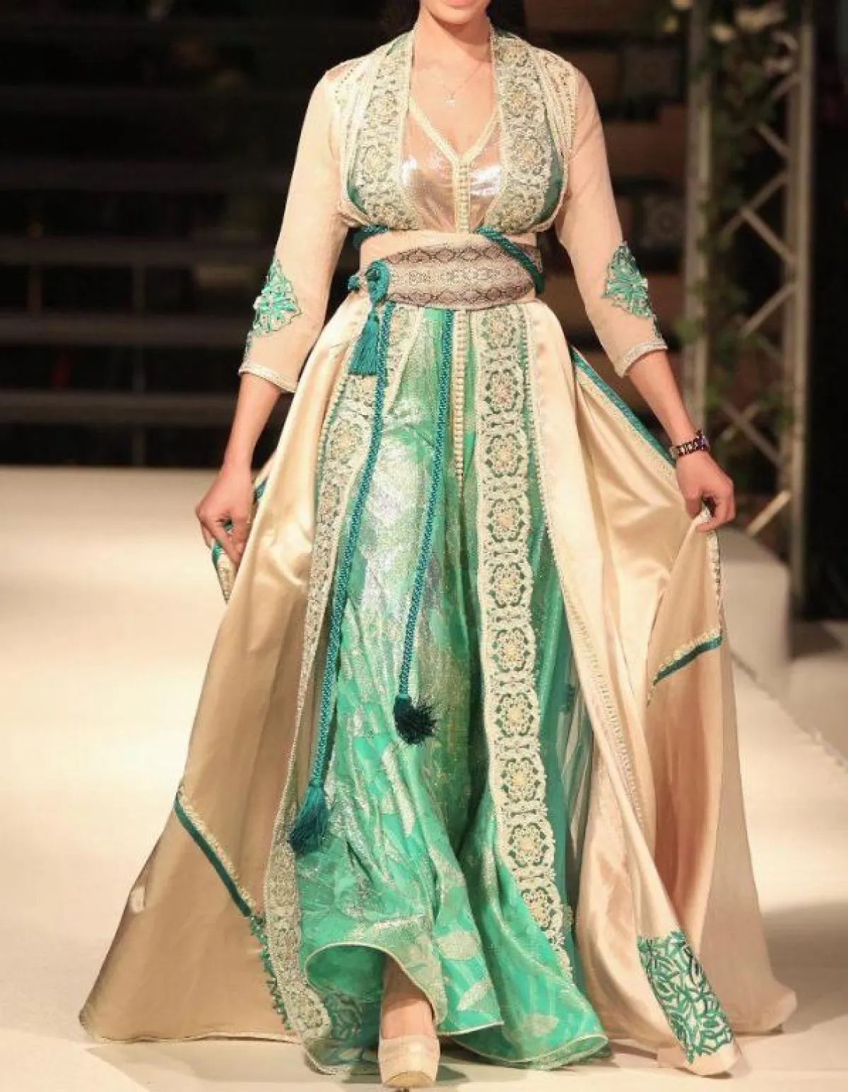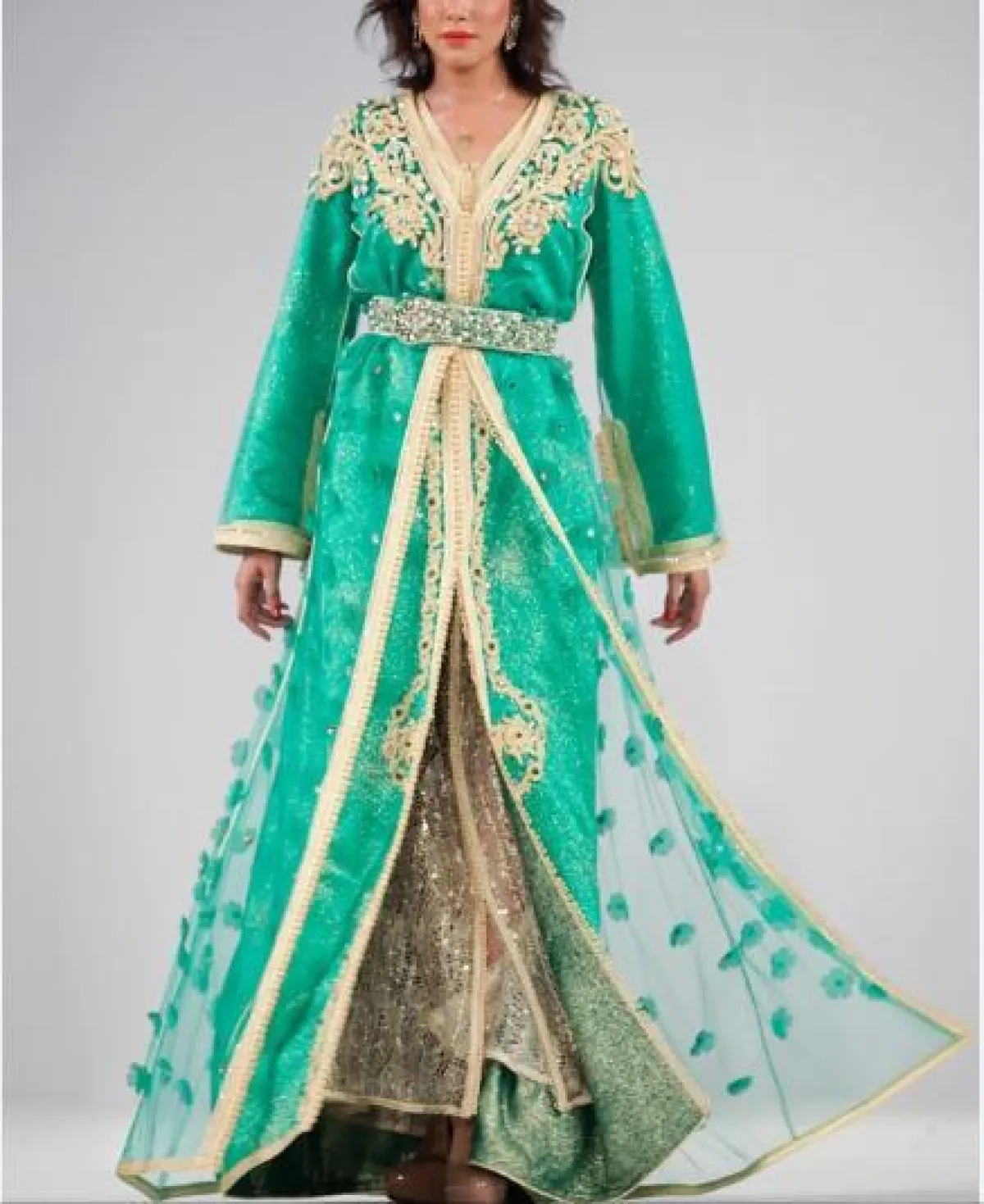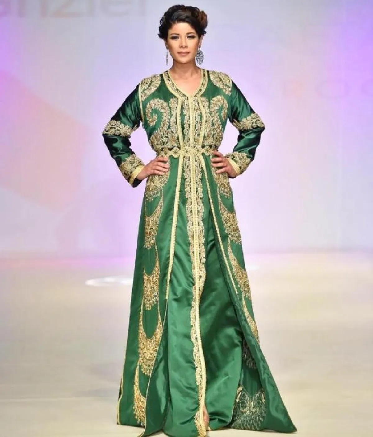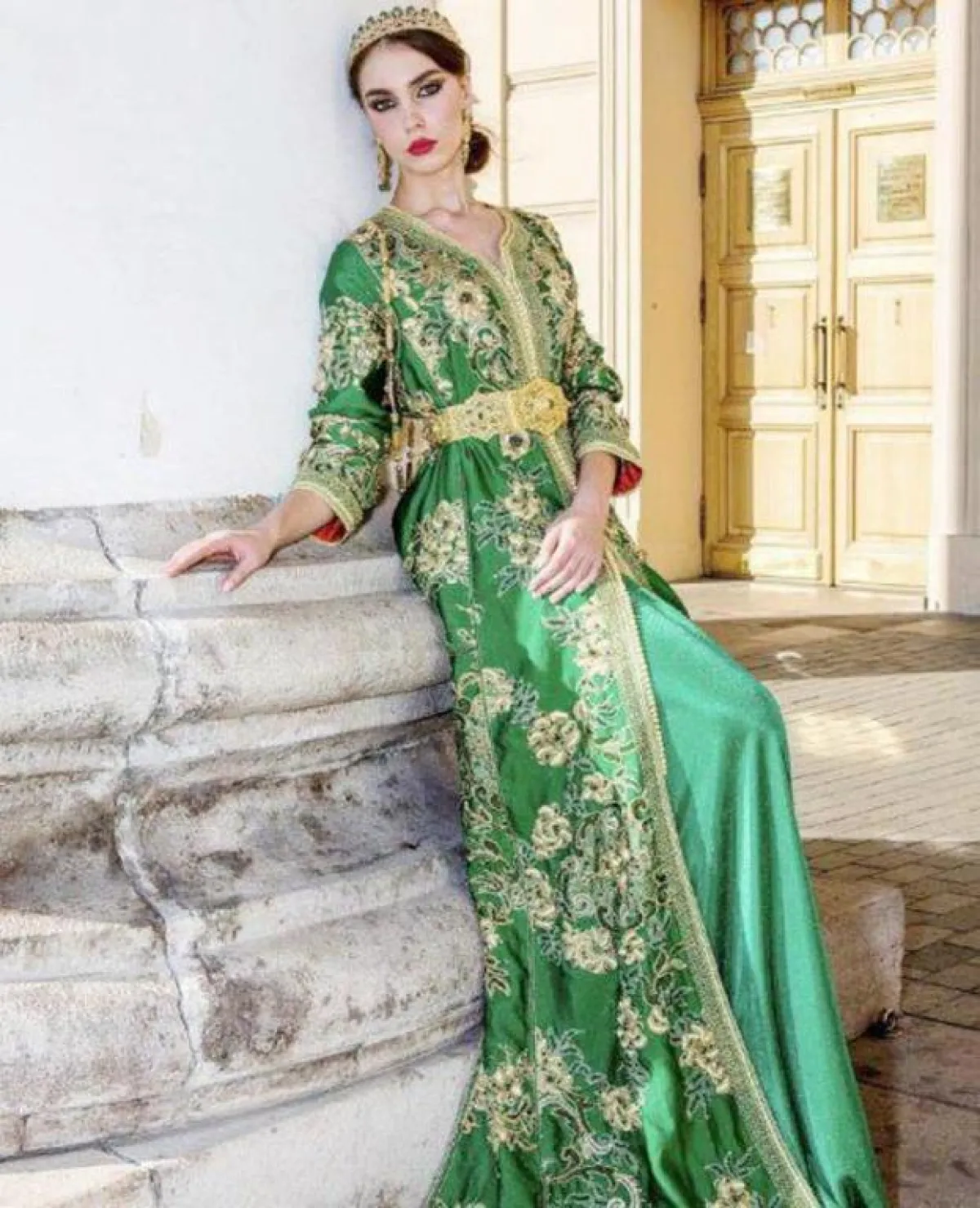 لإطلالة أنثوية ناعمة اخترنا لكِ قفطانًا أخضر بخطوط سوداء وزهور صفراء ضخمة، أو قفطانًا أخضر بدرجة داكنة منقوشًا بزهور حمراء مع حزام خصر، وكذلك قفطانًا أخضر بزهور ذهبية وحزام خصر ذهبي ضخم، ومن الممكن أن ترتدي قفطانًا بتصميم مختلف باللون اللبني المطرز بالذهبي ومُزيَّن بقماش أخضر في عدة مناطق، أو قفطانًا أخضر مُطرزًا بالذهبي ويزينه قماش سكري في الأسفل، وكذلك يمكن أن تتزيني بقفطان من المخمل الراقي المُزيَّن على الأطراف ومنطقة الصدر بفصوص ذهبية وزهور حمراء، وآخر أخضر مُزيَّن بتطريزات ذهبية وقماش سكري على أطراف الأكمام وفي الأسفل، مع حزام مليء بالنقوش والتطريزات.