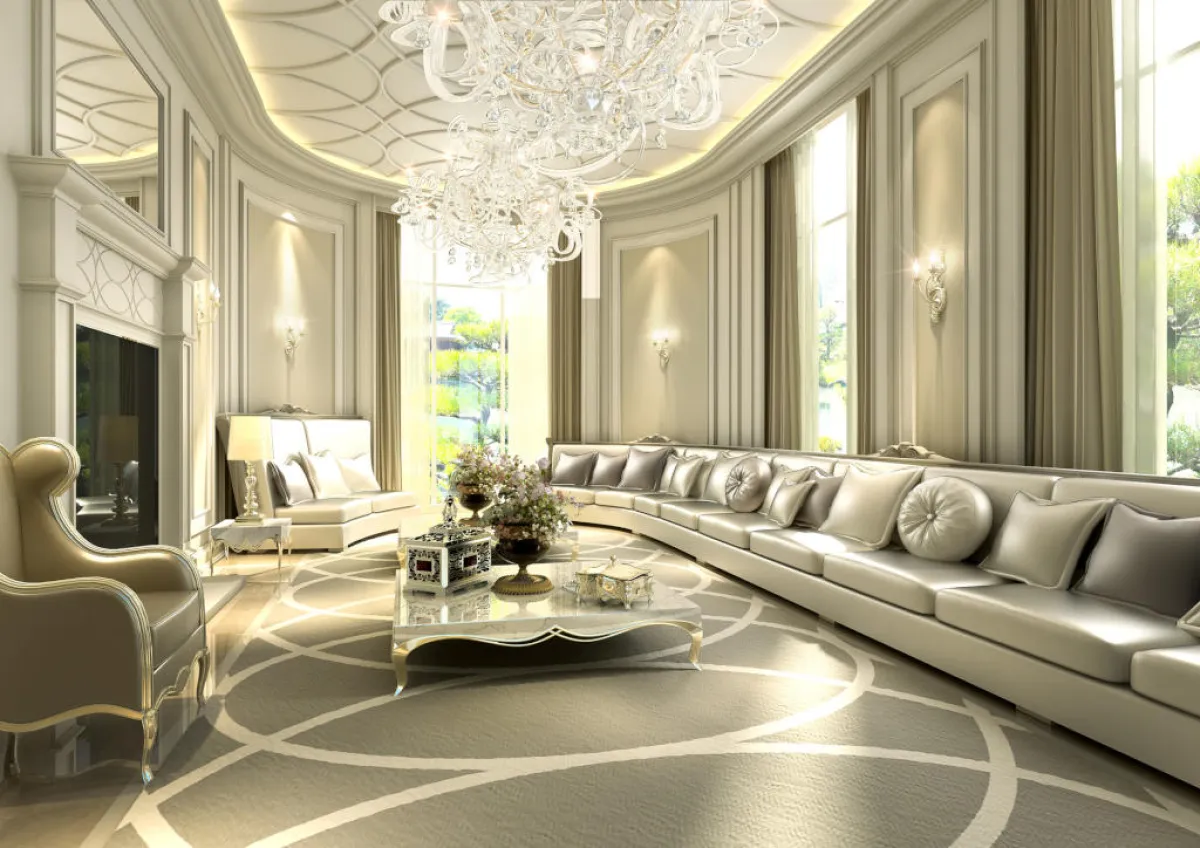 • يُصمّم السقف بالـ"جبس بورد"، بعيدًا عن السقف المستعار، مع الإشارة إلى أنه يجب الابتعاد عن البساطة في الديكورات المختارة، مع التركيز على توزيع وحدات الإنارة المخفية والثريات.