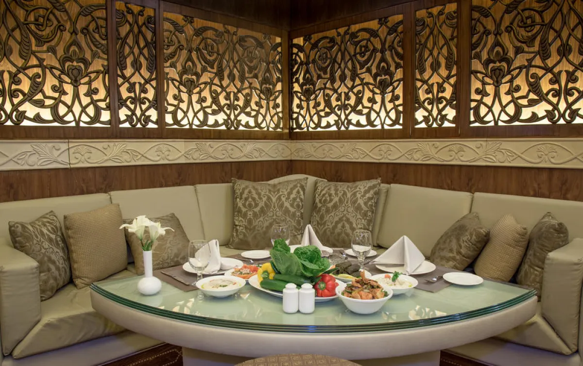 • يُمكن أن تتدلَّى من سقف الديوان أربع ثريَّات مشغولة من الكريستال، على أن يُوزَّع كلٌّ منها على 4 صناديق نافرة عن السقف بحدود 25 سنتيمترًا، وفيها إنارة مخفيَّة.